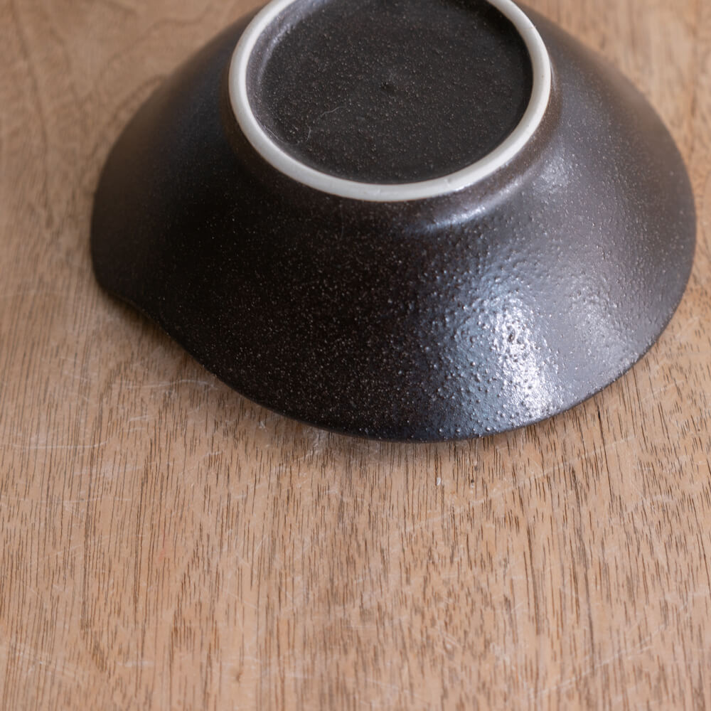 外側には、しっとりとした黒マットの釉薬が施され、手に心地よくフィットします。無骨すぎず、品のある仕上がりで、盛り付けた料理に深みを与えます。