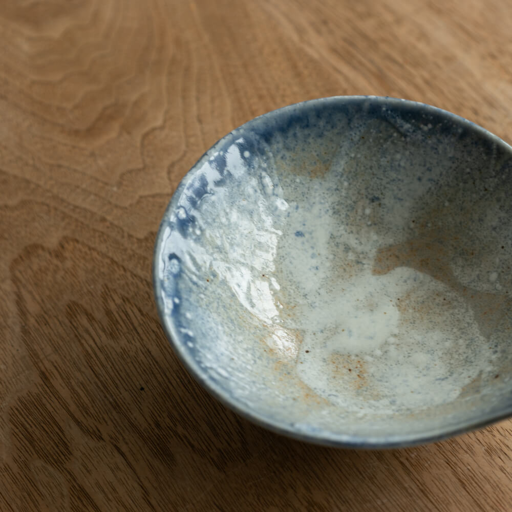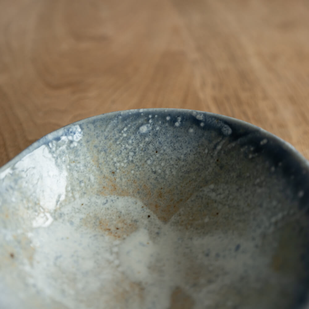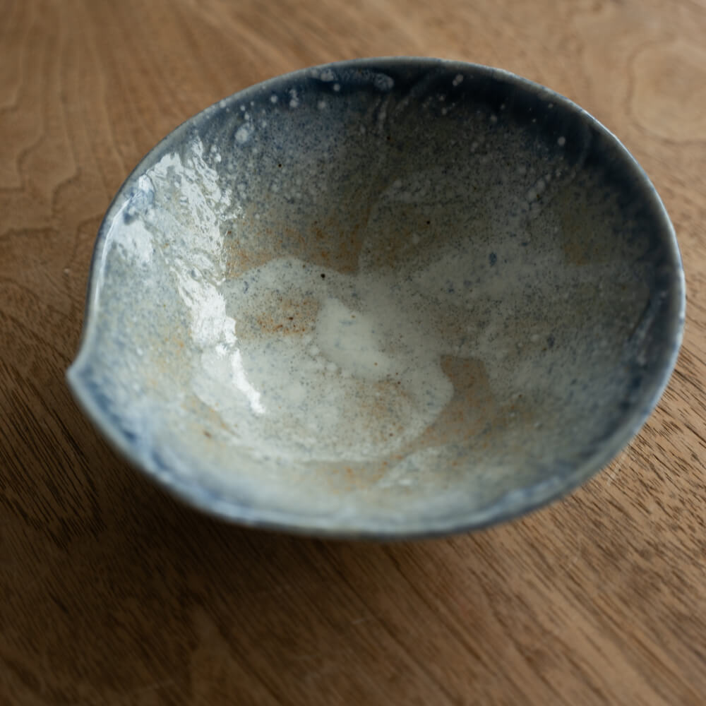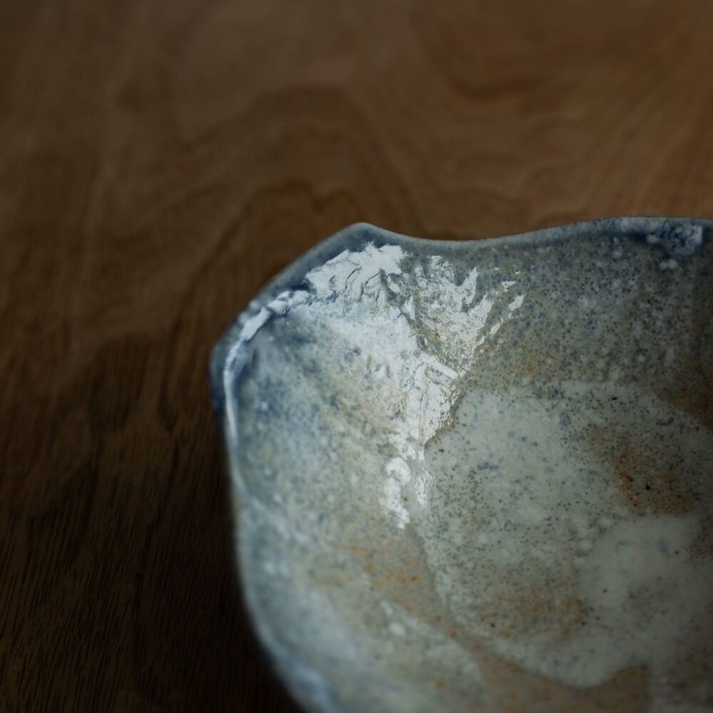 静かににじむ青と、釉薬のうねりが生み出す豊かな表情。器のフォルムにも自然な動きがあり、光のあたり方で印象を変える呑水です。柔らかな青釉が料理をやさしく包み込み、日常の一皿を上品に引き立てます。