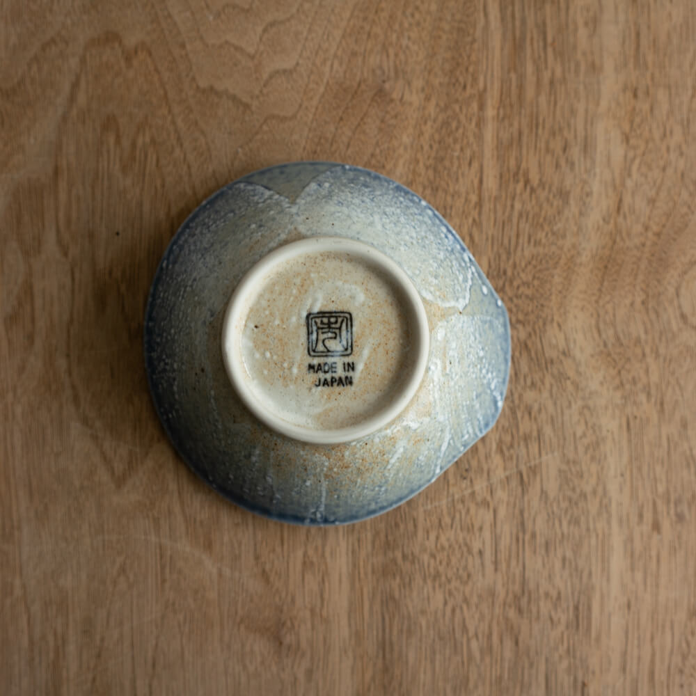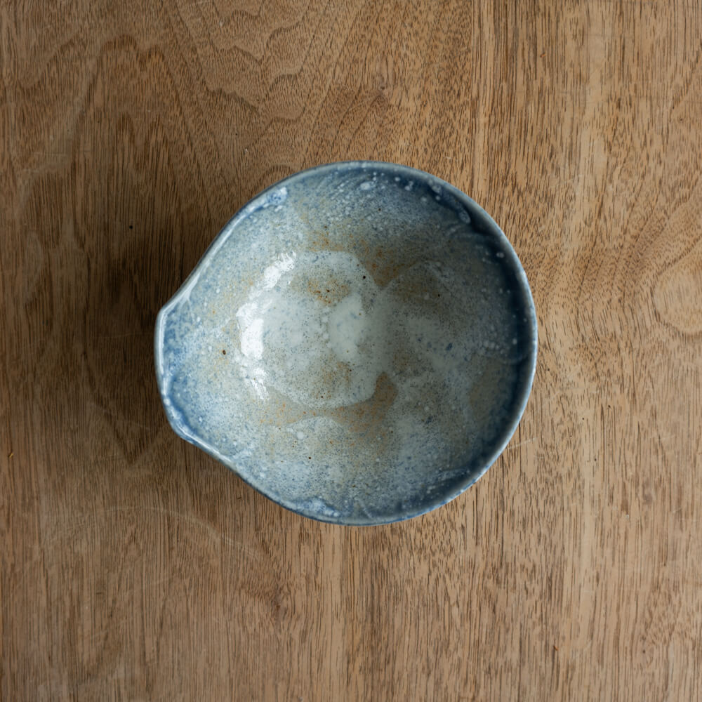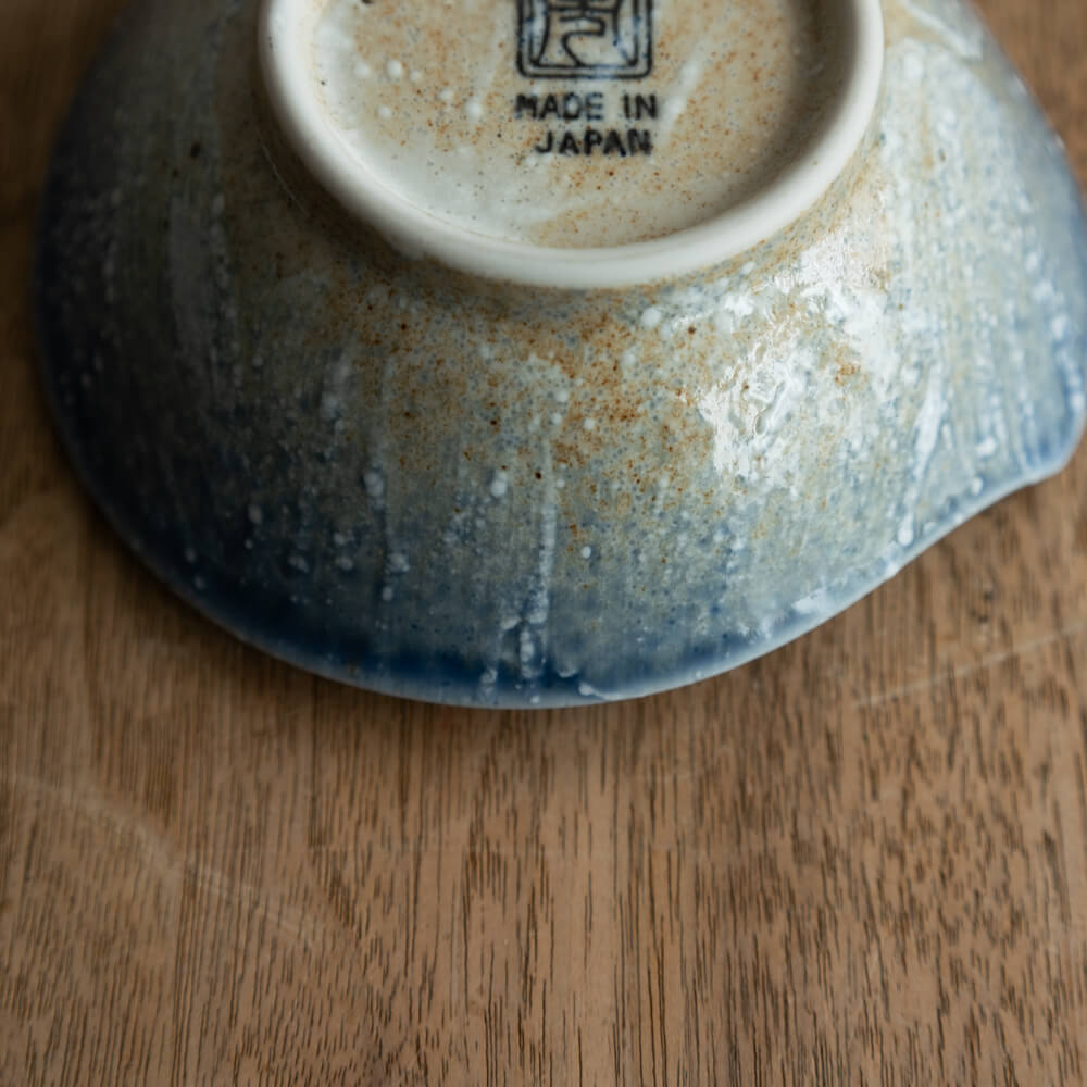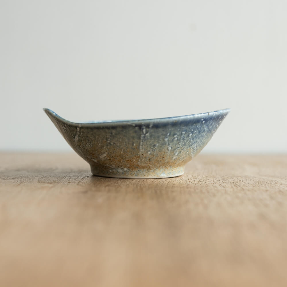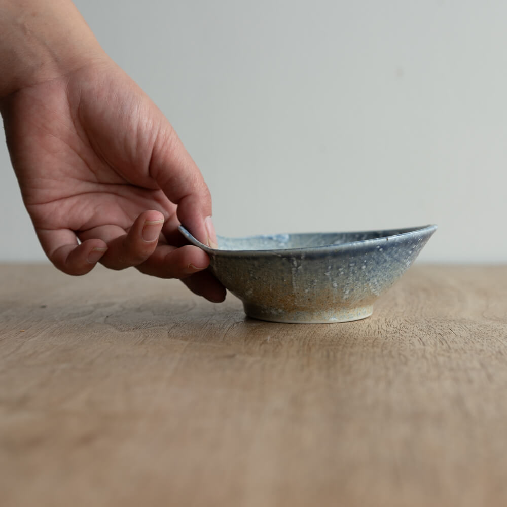 静かににじむ青と、釉薬のうねりが生み出す豊かな表情。器のフォルムにも自然な動きがあり、光のあたり方で印象を変える呑水です。柔らかな青釉が料理をやさしく包み込み、日常の一皿を上品に引き立てます。