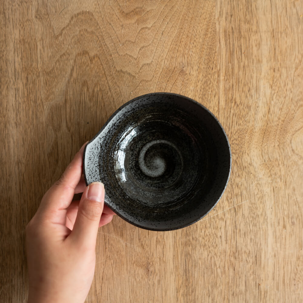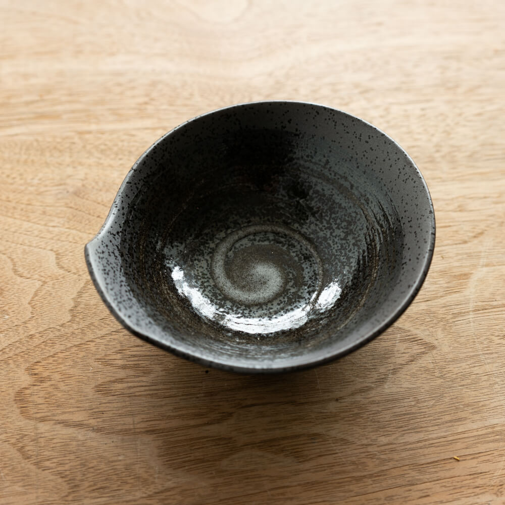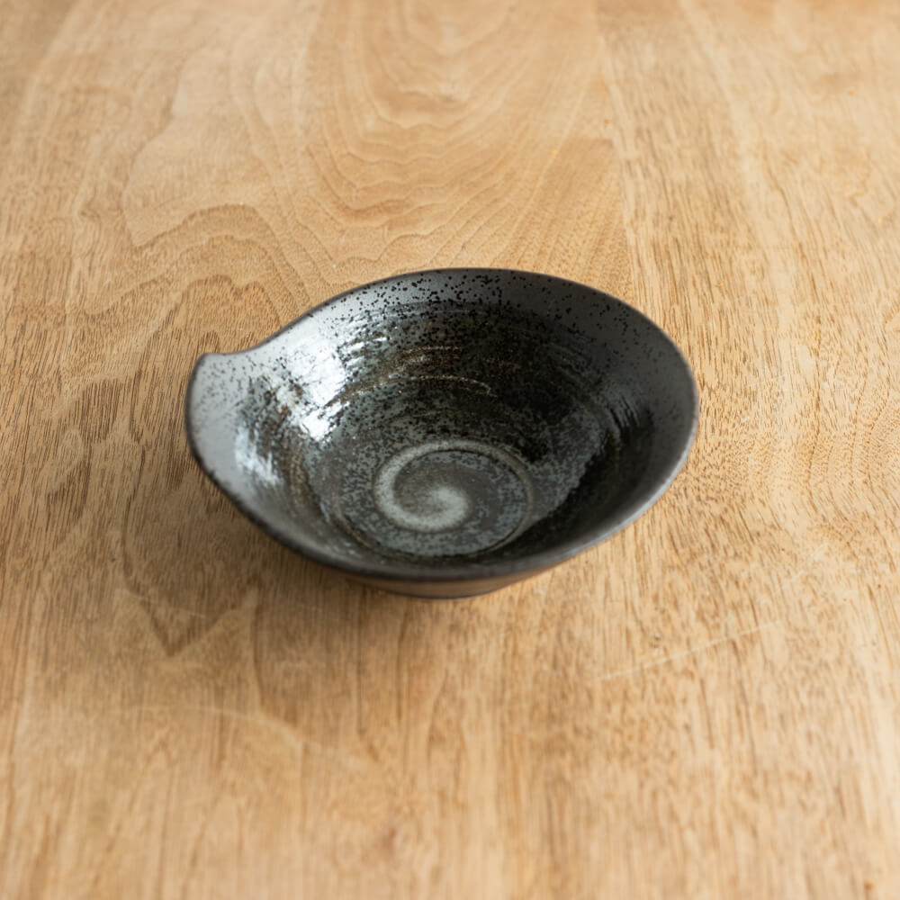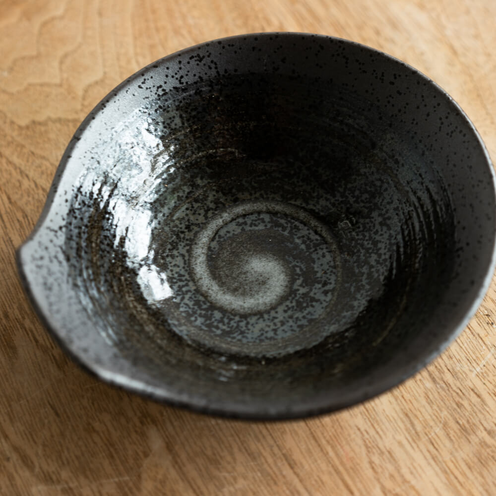 深みのある黒にしっとりと浮かび上がる渦模様。余白の美しさが際立ち、料理の色や質感を一層引き立てる呑水です。落ち着いた存在感と上品な印象で、日常の食卓から特別なひとときまで幅広く活躍します。