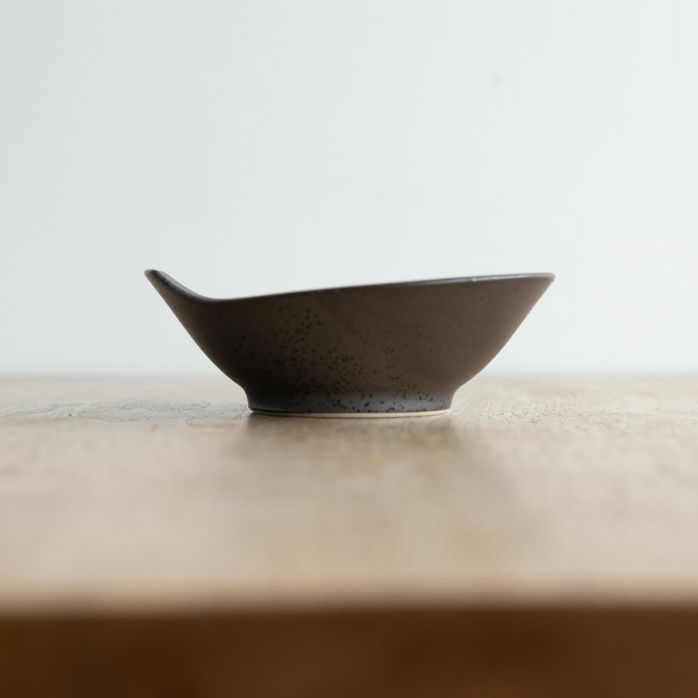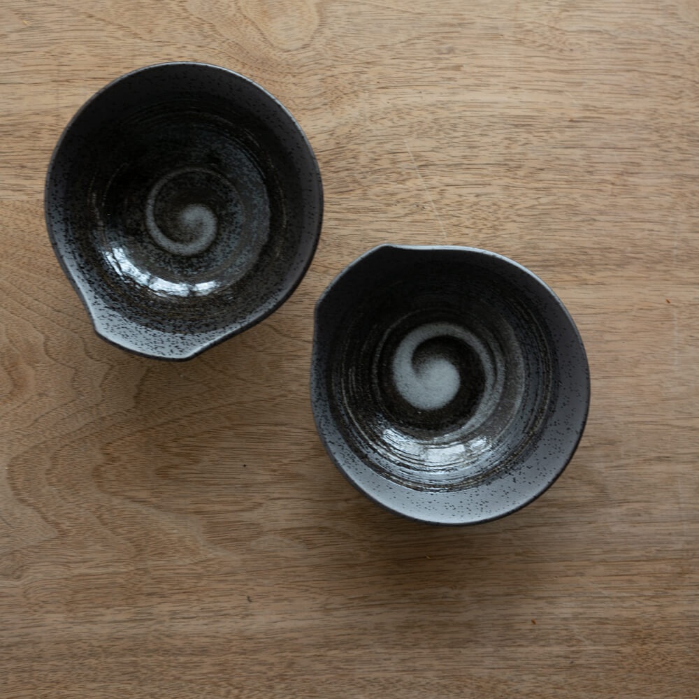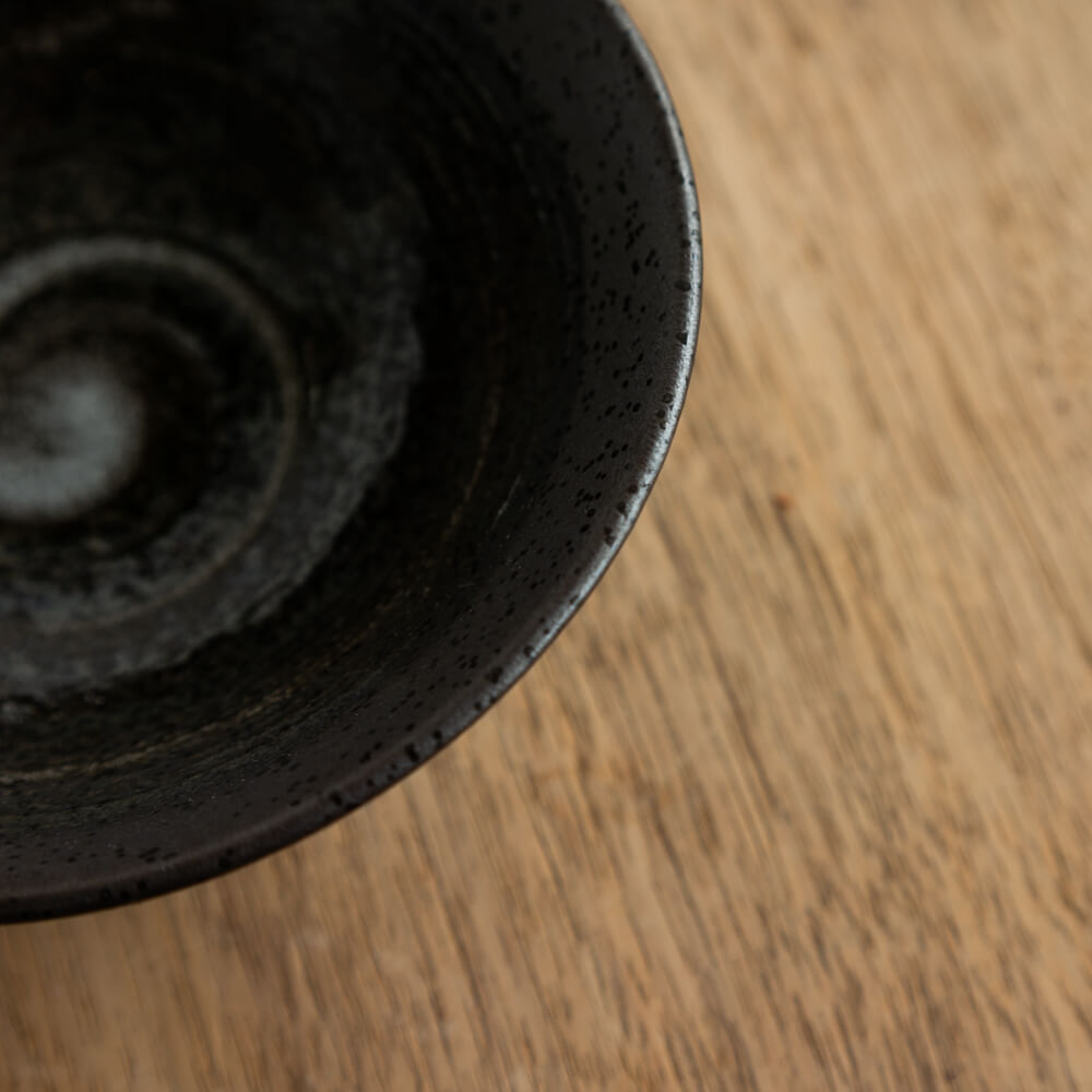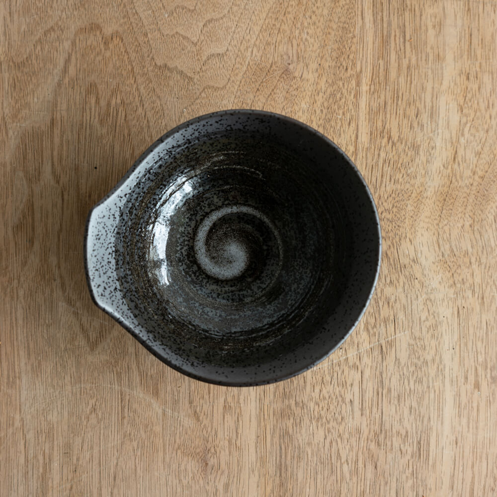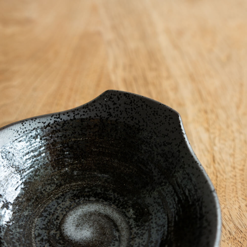 深みのある黒にしっとりと浮かび上がる渦模様。余白の美しさが際立ち、料理の色や質感を一層引き立てる呑水です。落ち着いた存在感と上品な印象で、日常の食卓から特別なひとときまで幅広く活躍します。