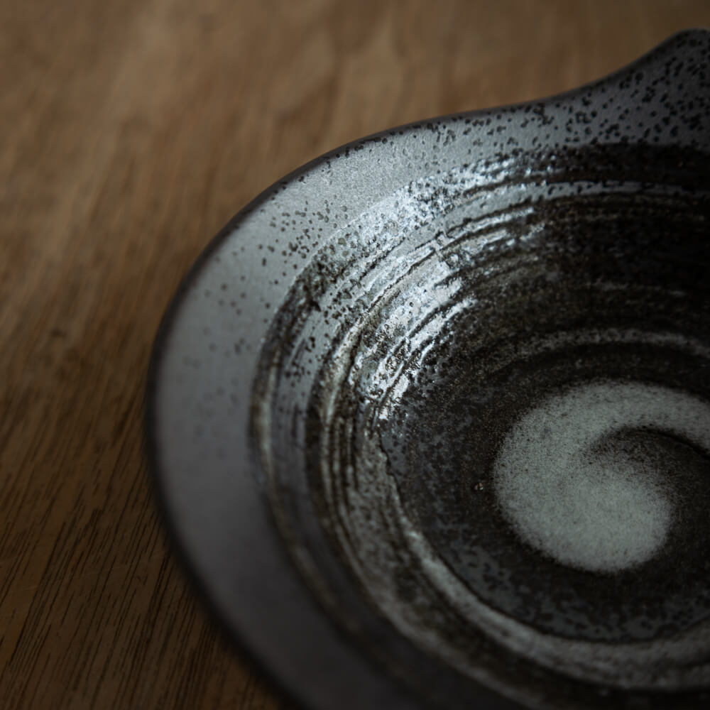 釉薬の流れによって生まれる渦模様は、ひとつひとつ異なる表情を見せる特別な景色。料理を盛りつけたとき、控えめな装飾がほどよいアクセントとなり、器の上に静かな美しさを生み出します。