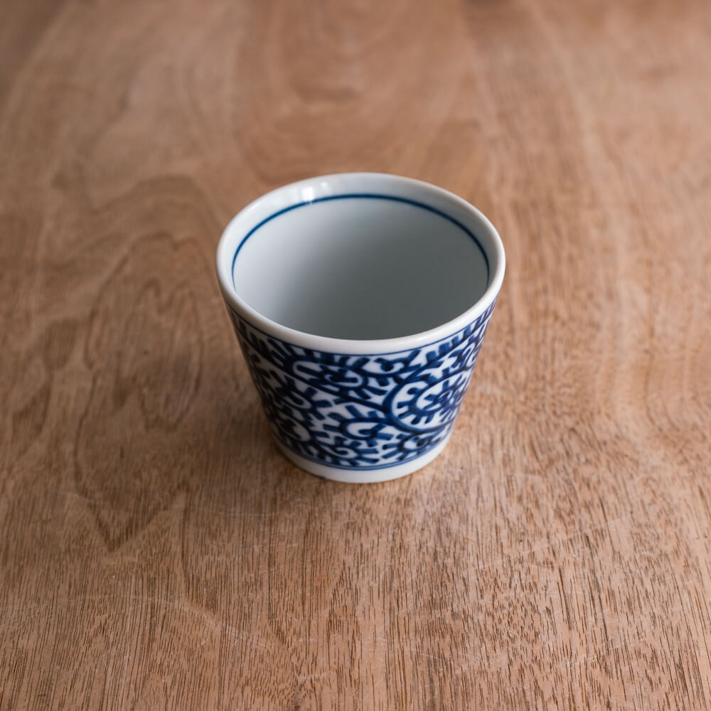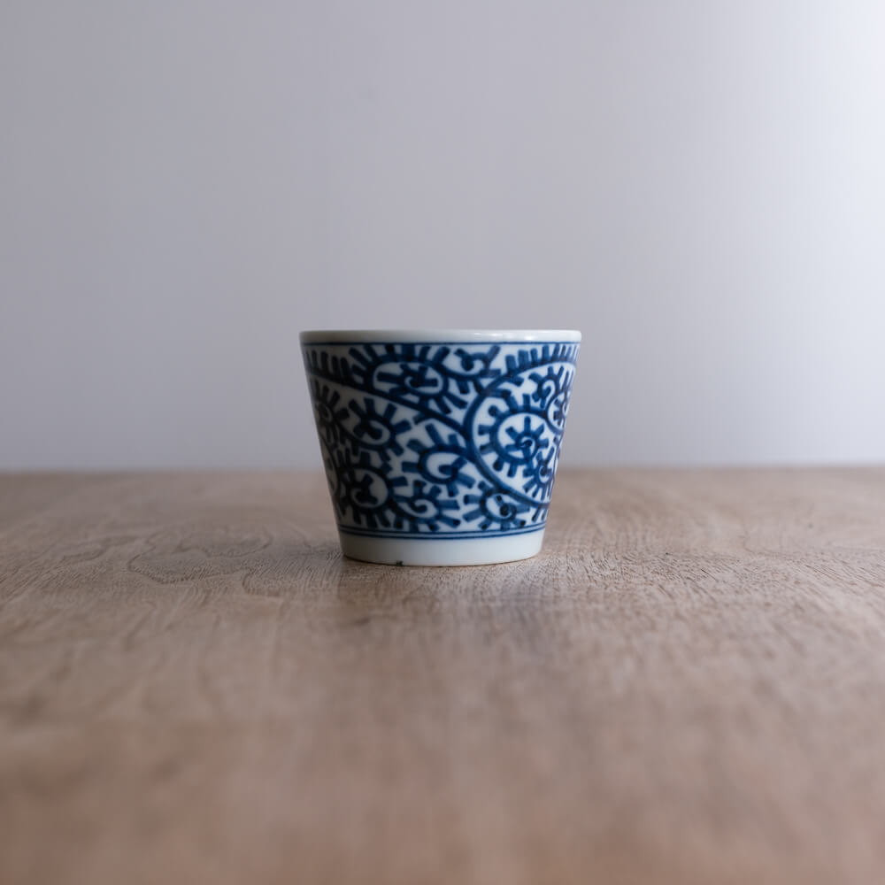深い藍色で描かれた唐草模様が目を惹く、上品なそばちょこ。素朴でありながら華やかさを添えるデザインは、和の食卓をぐっと引き締めてくれます。使い方次第でさまざまなシーンに馴染む万能な器です。