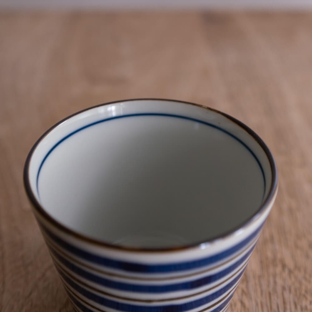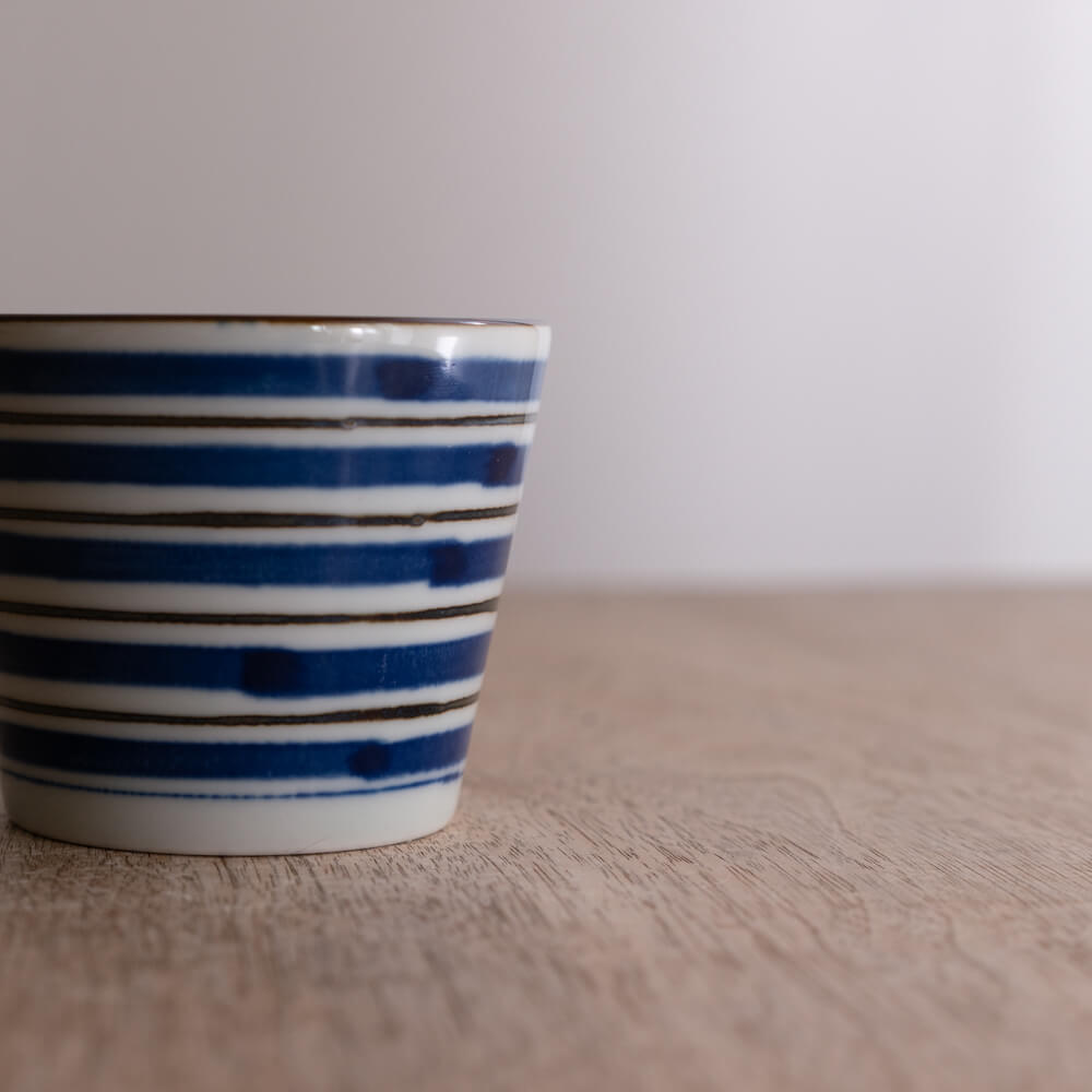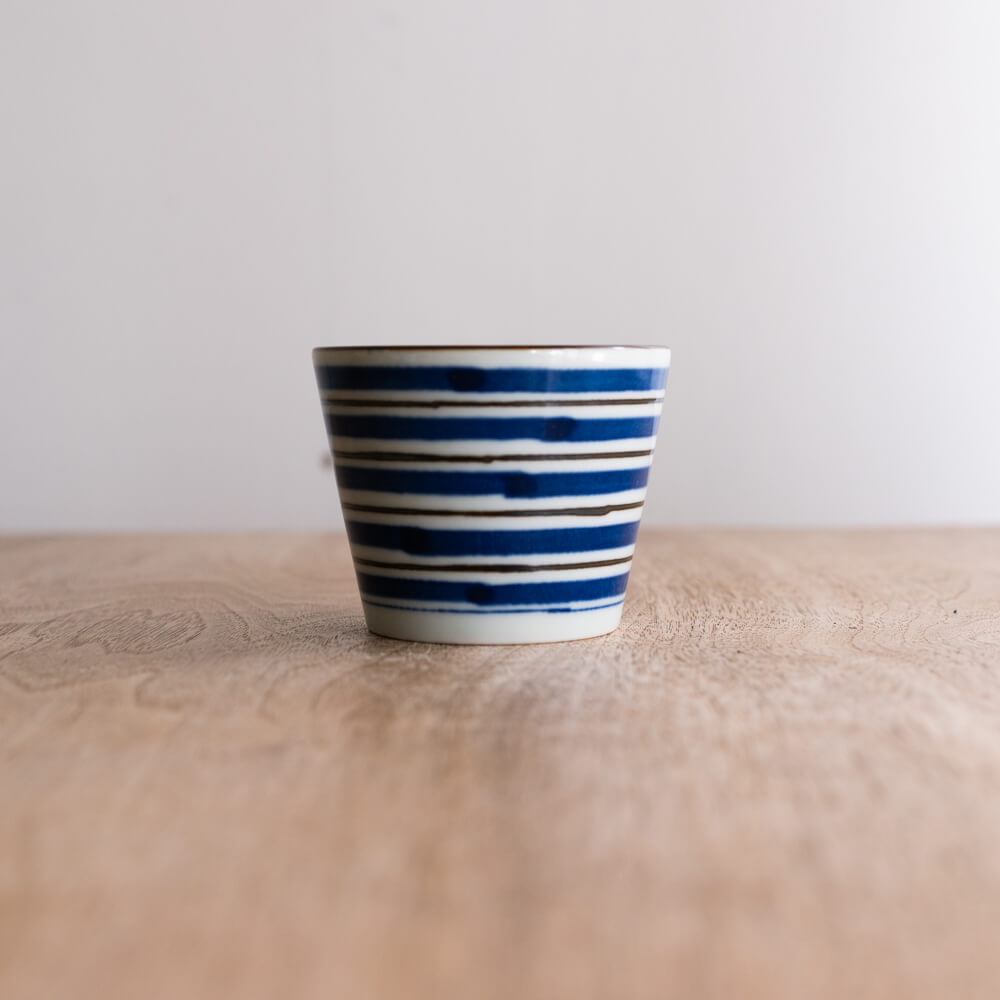 潔いボーダー柄と藍の濃淡が印象的なそばちょこ。すっきりとしたデザインは、日常の食卓にも特別な席にもすっと馴染み、料理を引き立てる背景のような存在です。シンプルながらも印象に残る佇まいで、和食器好きの方にも人気の高いデザインです。