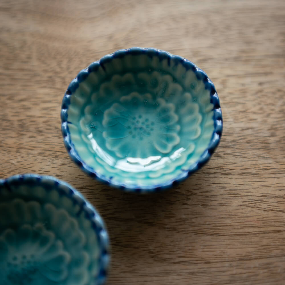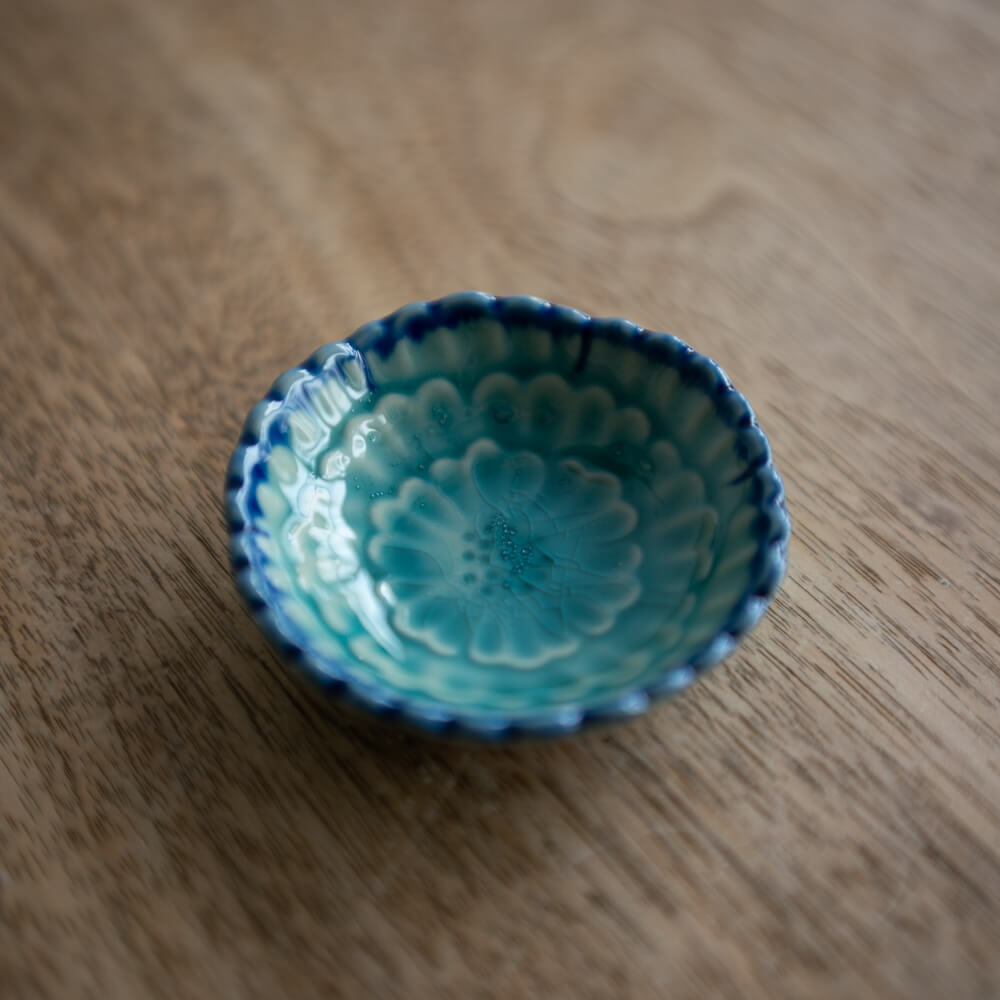 器全体に広がる菊花のレリーフ模様と、波打つ縁取り。小さなサイズながらも手仕事ならではの柔らかなラインが印象的です。上から見ても、横から見ても、美しい佇まい。