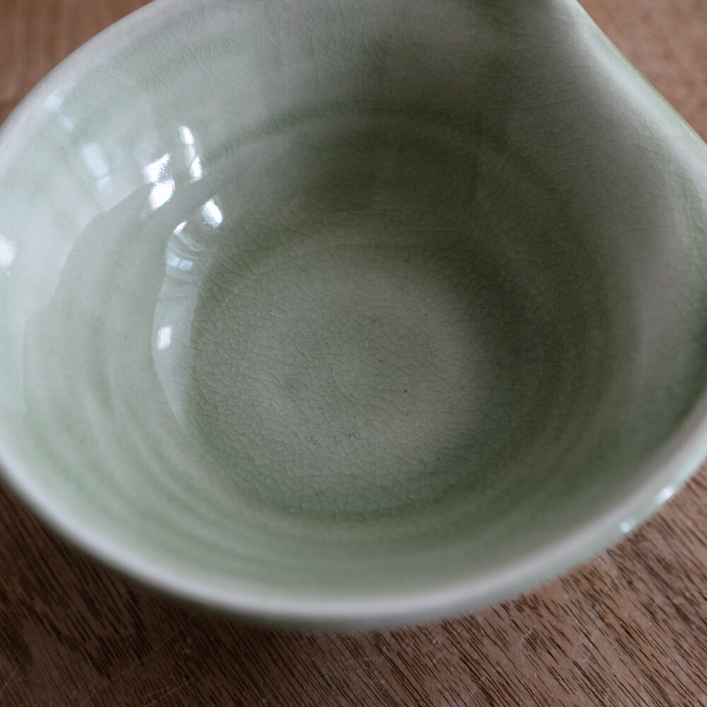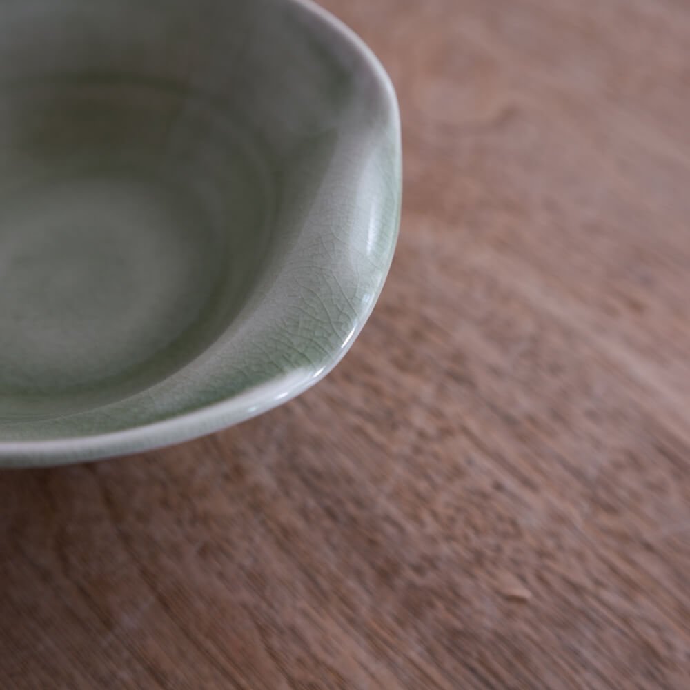 翡翠色のやさしい釉調に、きめ細かな貫入(かんにゅう)模様が広がります。光の角度や料理の色によって印象が変わり、まるで自然が描いた絵のよう。おもてなしの席でも日常でも、静かな存在感を放ちます。