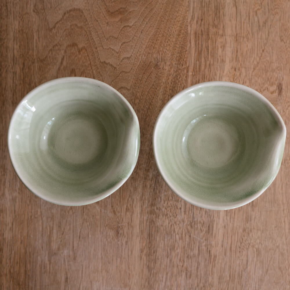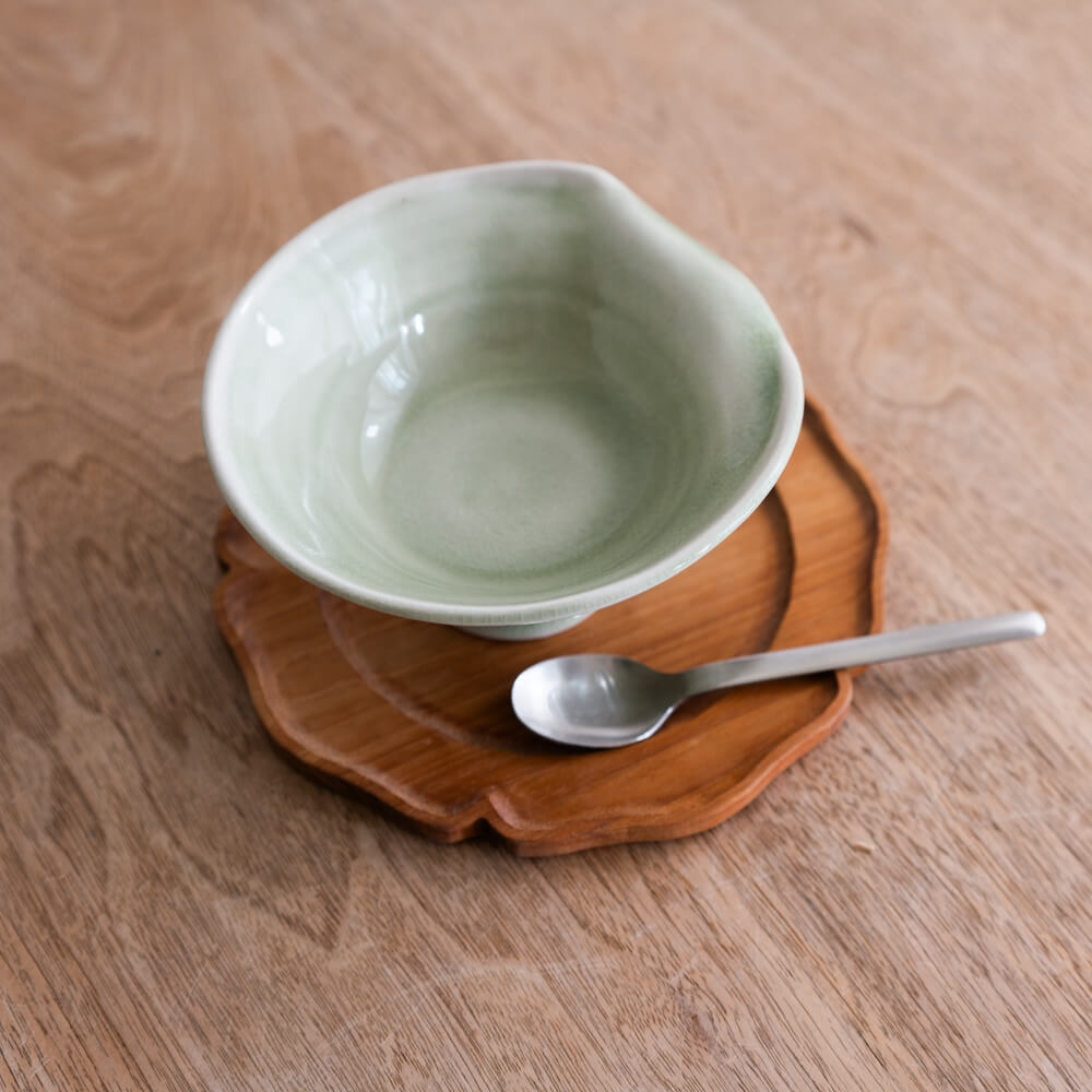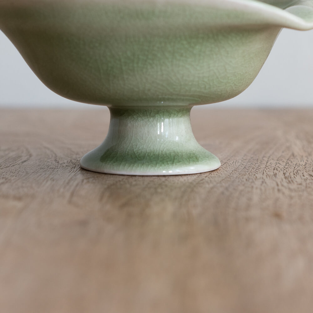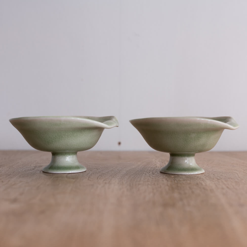 淡い翡翠色の釉薬がやわらかくにじむ、上品な印象のデザートカップです。高台のある姿は、和の趣と洋の華やかさをあわせ持ち、テーブルに上質な余白を生み出します。手仕事の景色が、ひとつひとつ異なる表情を楽しませてくれます。