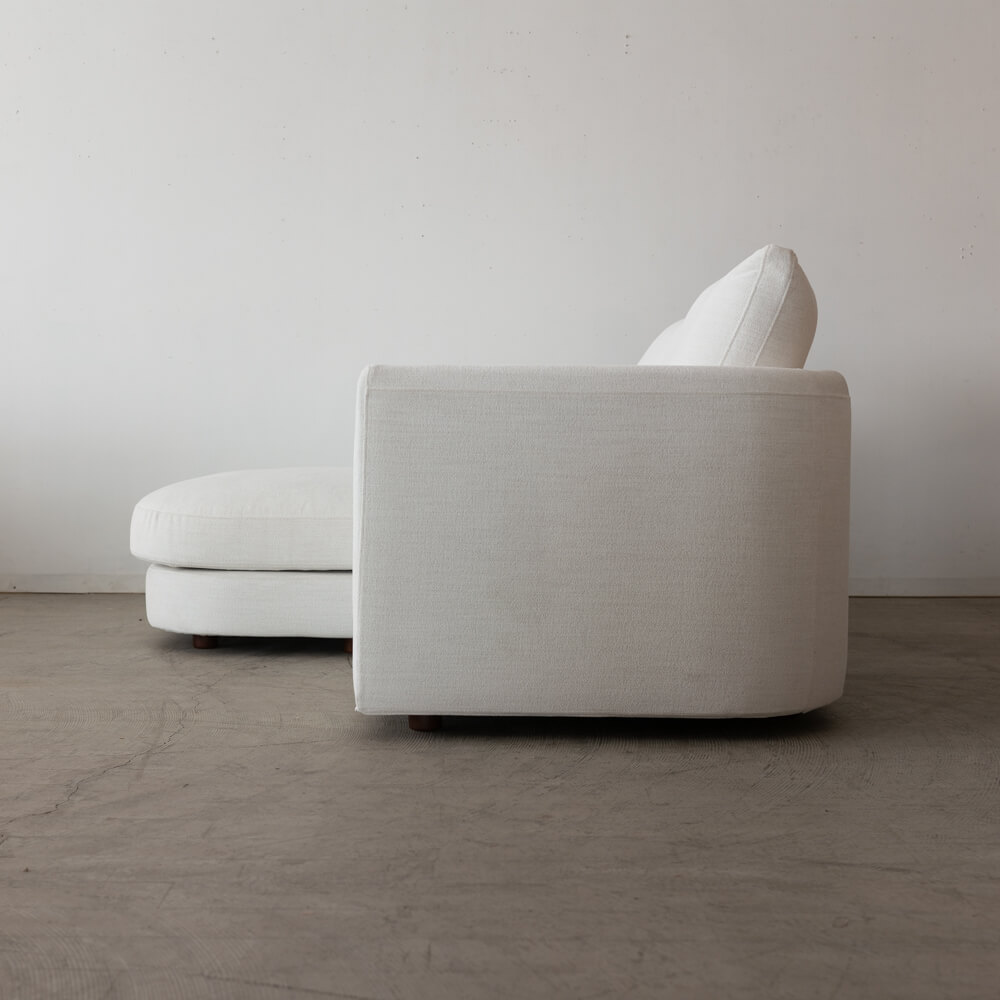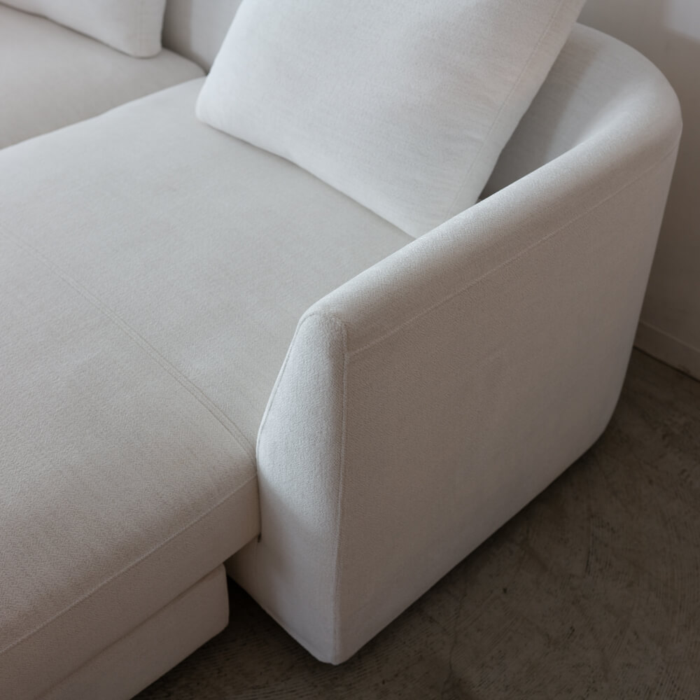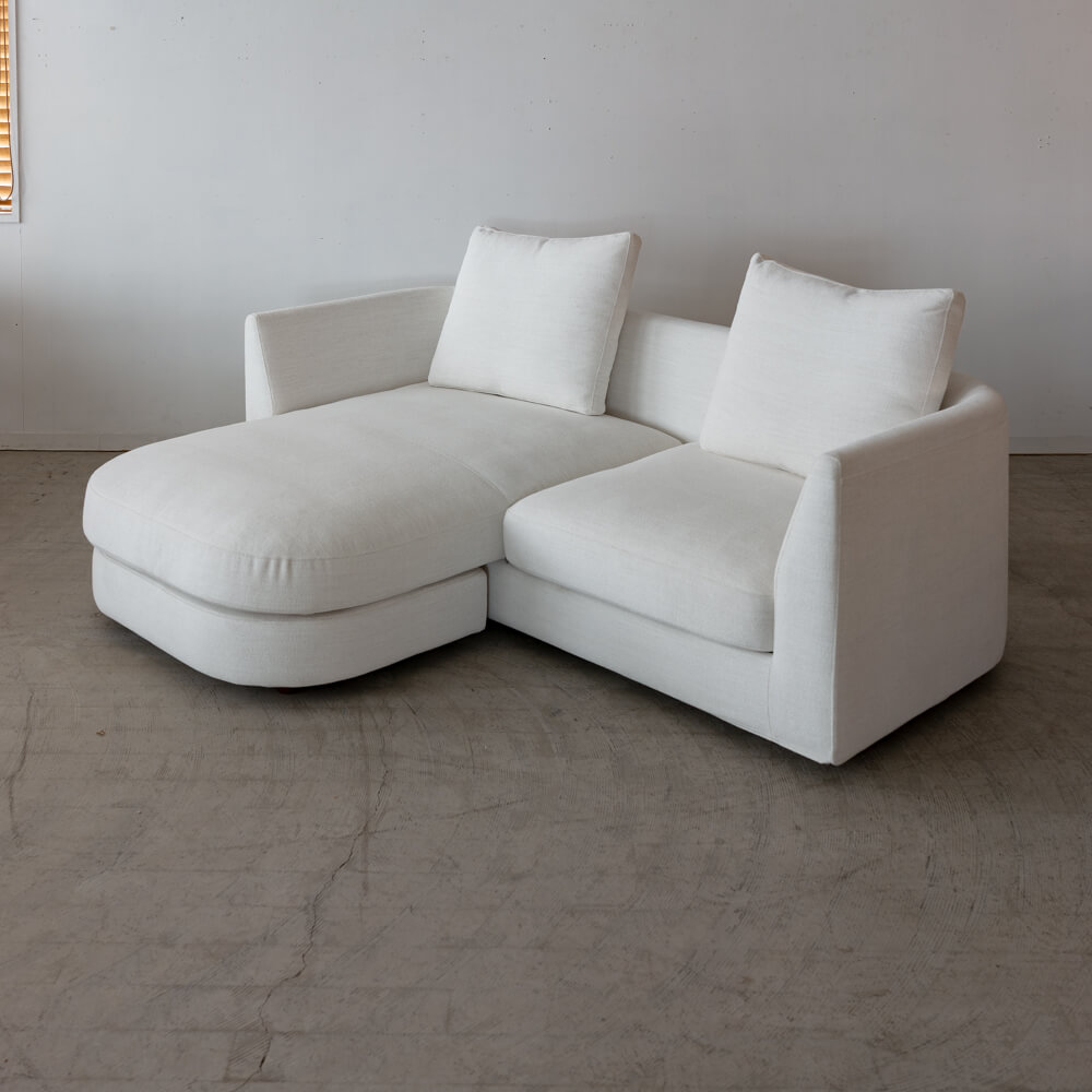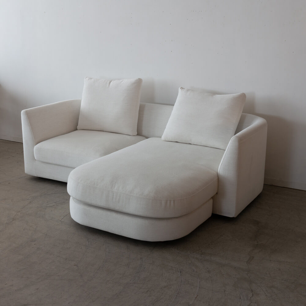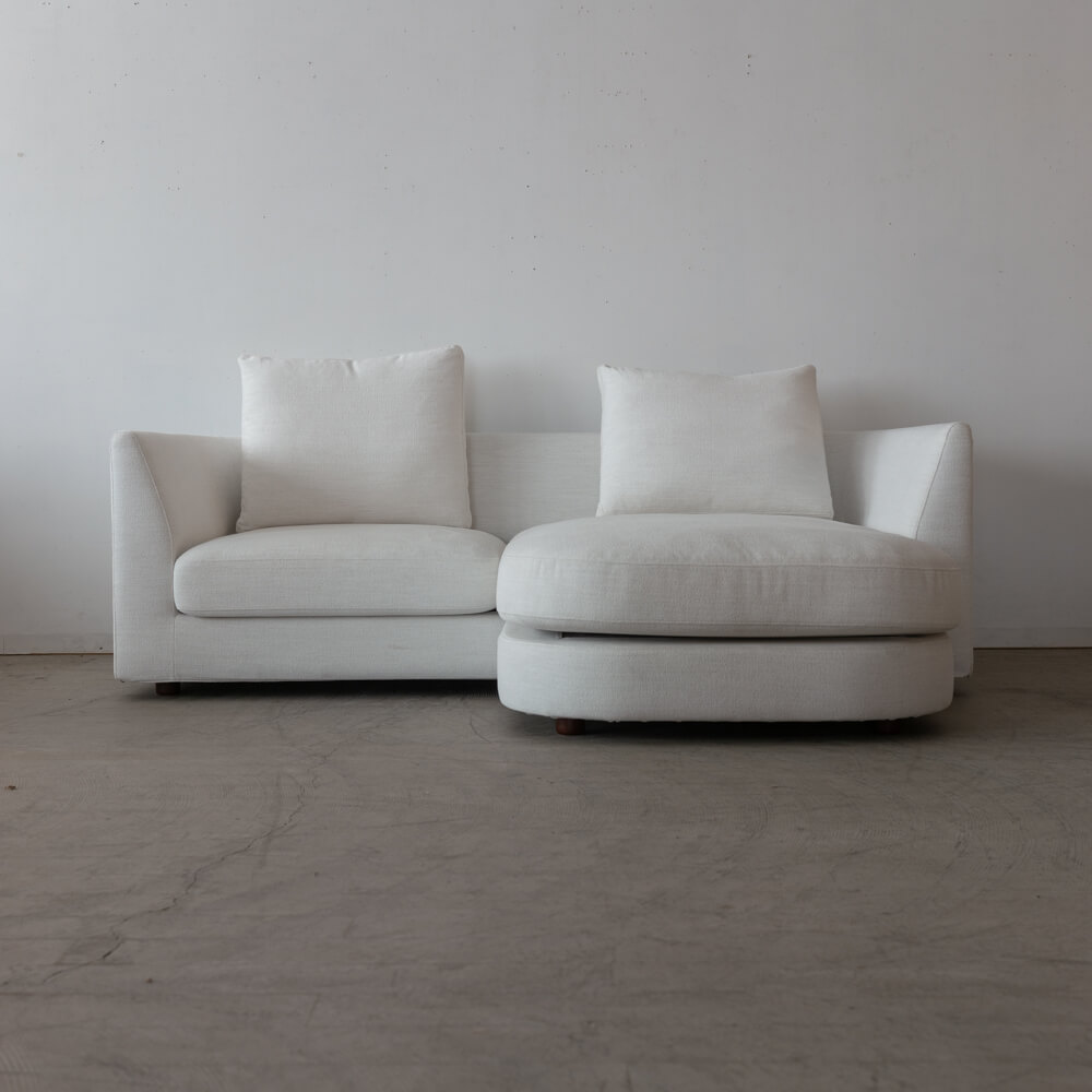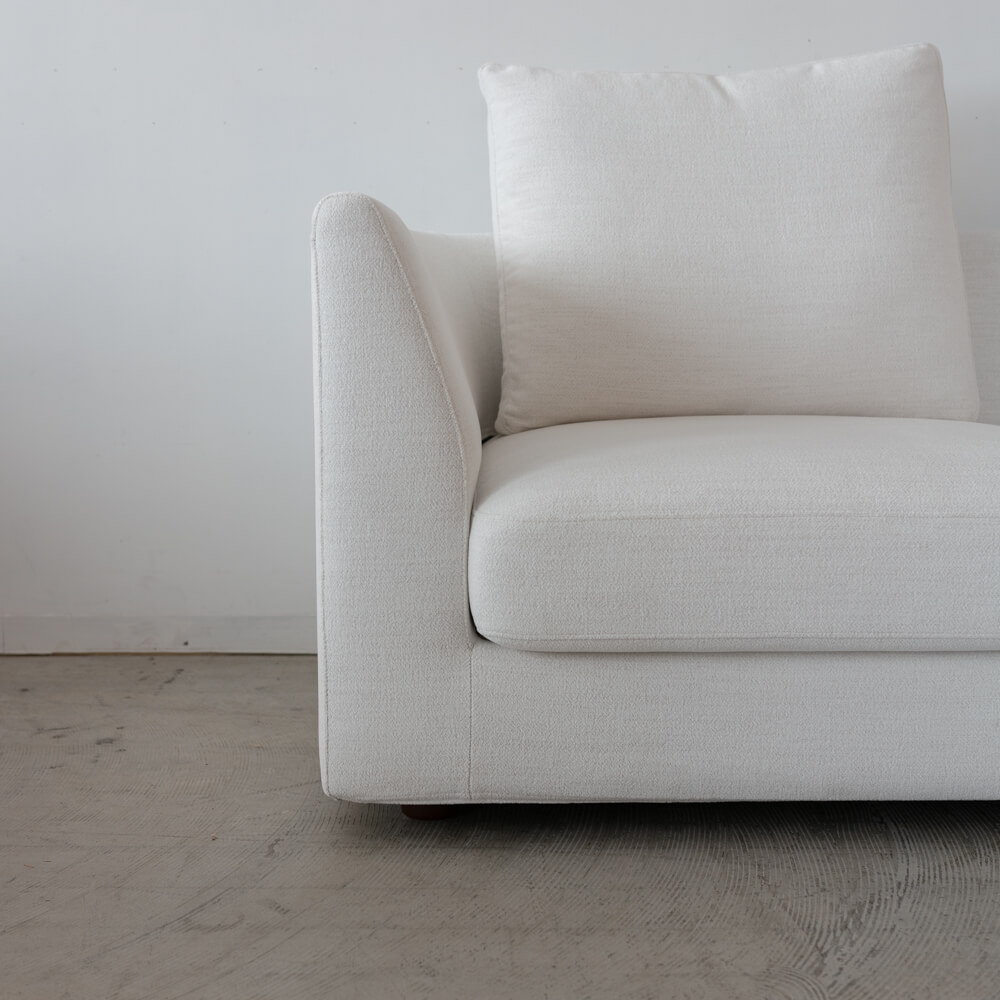 やわらかな白が空間を明るく包み込み、身体をふんわりと受け止めてくれる3Pカウチソファ。座クッションを入れ替えるだけで左右のレイアウト変更が可能なフレキシブル仕様で、ライフスタイルに合わせた心地よいくつろぎ方を楽しめます。ファブリックには、お手入れが簡単なアクアクリーン生地を採用。美しさと機能性を両立した、リビングの主役になる一台です。