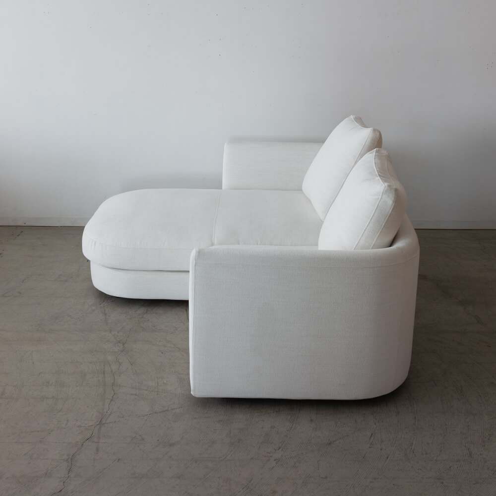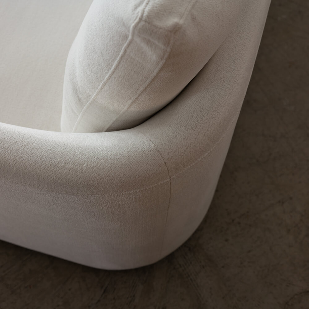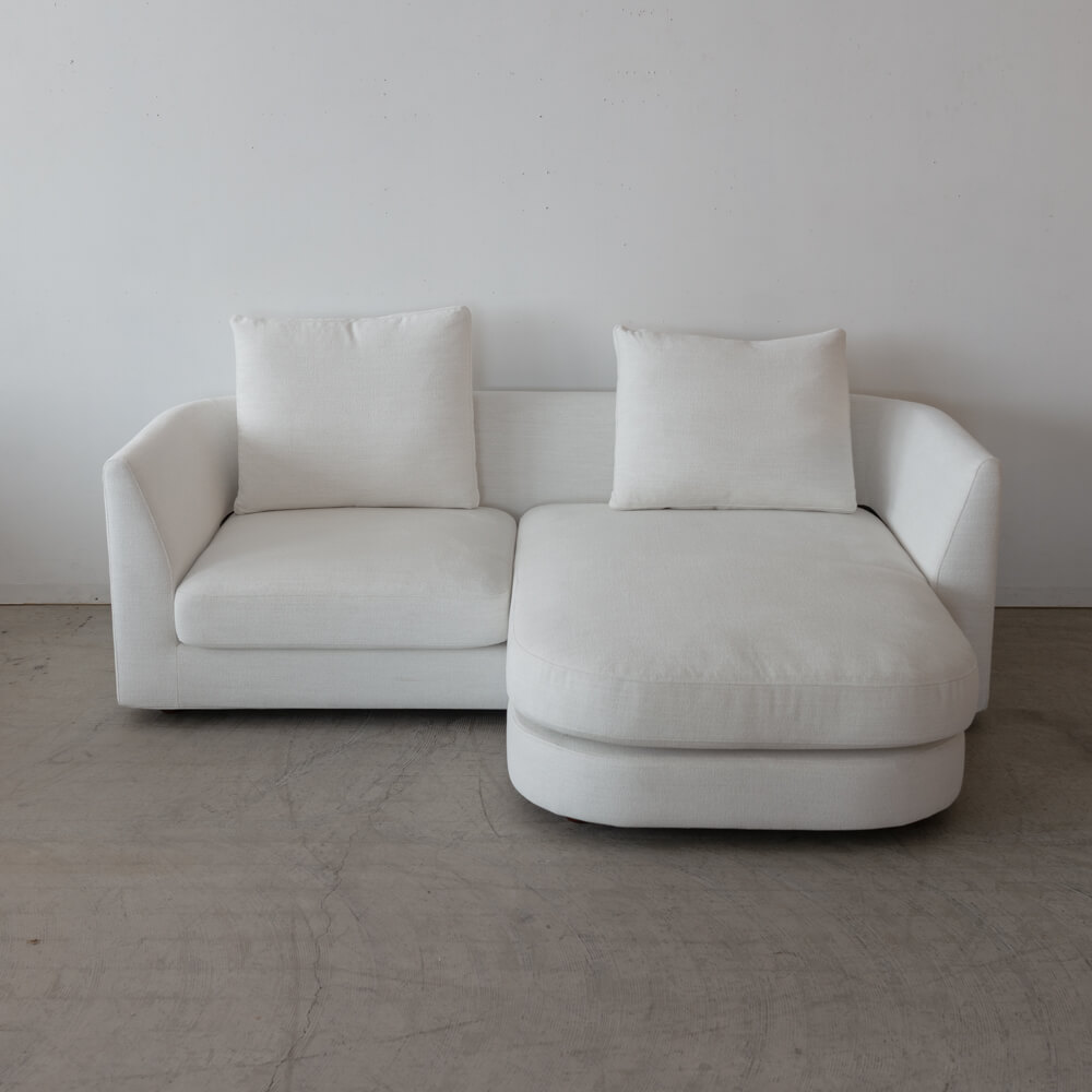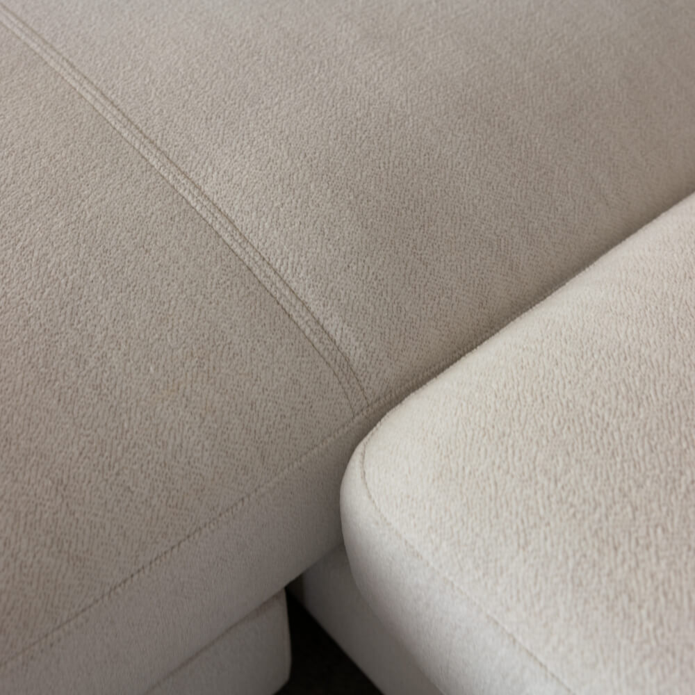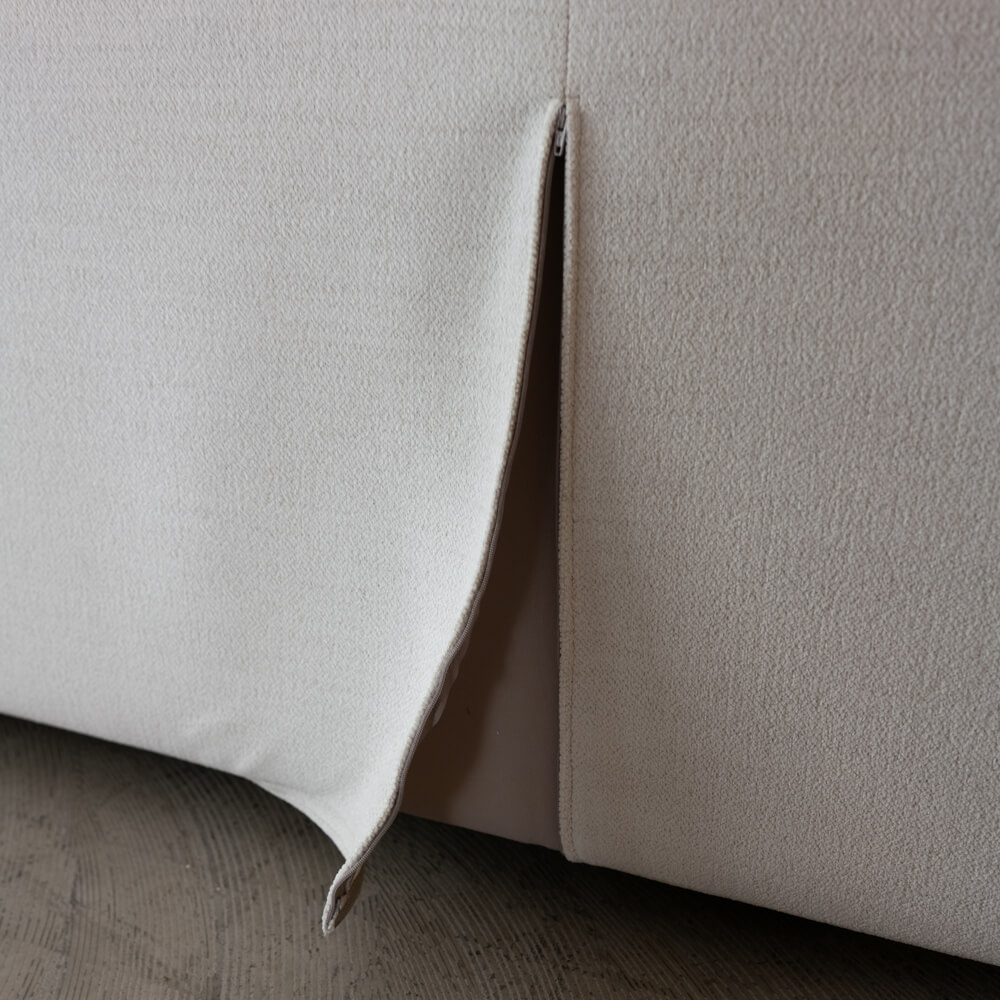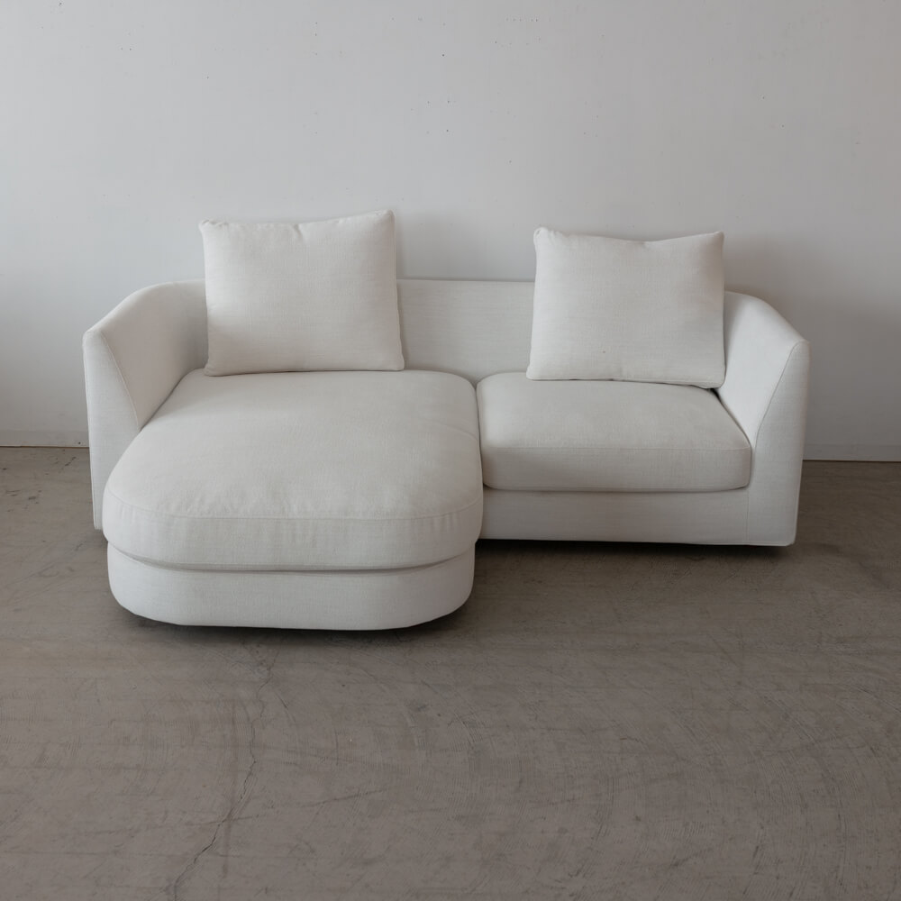やわらかな白が空間を明るく包み込み、身体をふんわりと受け止めてくれる3Pカウチソファ。座クッションを入れ替えるだけで左右のレイアウト変更が可能なフレキシブル仕様で、ライフスタイルに合わせた心地よいくつろぎ方を楽しめます。ファブリックには、お手入れが簡単なアクアクリーン生地を採用。美しさと機能性を両立した、リビングの主役になる一台です。