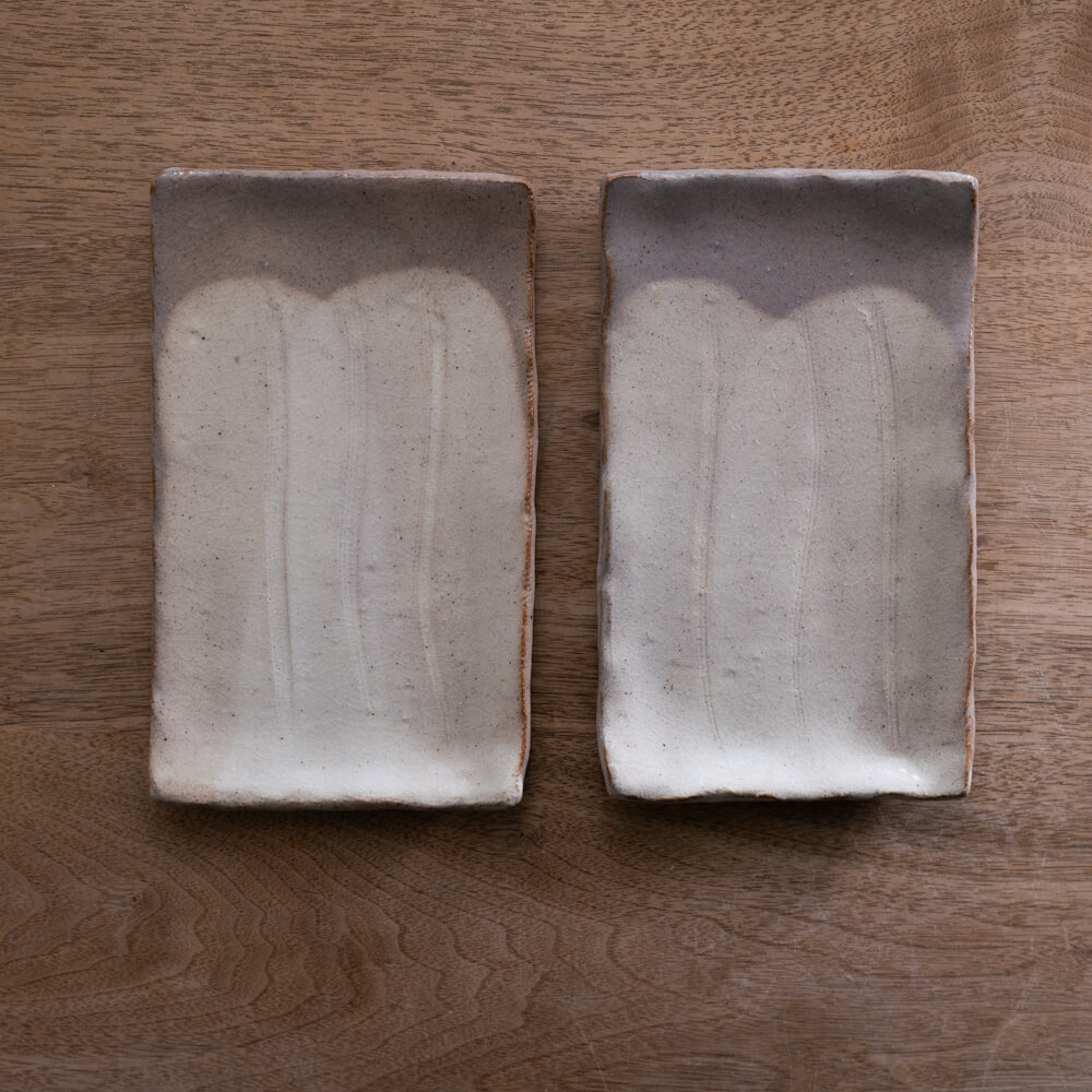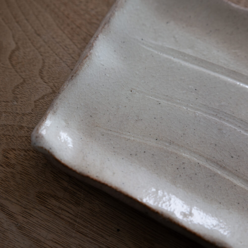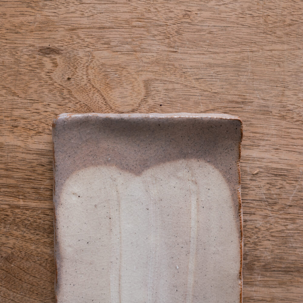 しっとりとした白釉と、焼き締められた土の質感が共存する手づくりの角皿。素地の表情を生かした塗分けが特徴で、ひとつとして同じものはありません。21cmの横長フォルムは、焼き魚や前菜の盛り合わせなど、和の一品を上品に引き立てます。
