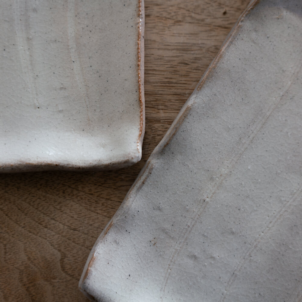 片側には土の表情を、もう一方にはやわらかな白釉を。焼成時の火の当たり具合や釉薬の濃淡によって生まれるグラデーションが、まるで風景画のよう。和食器らしい静謐さと、現代的なミニマルデザインの両方を兼ね備えています。