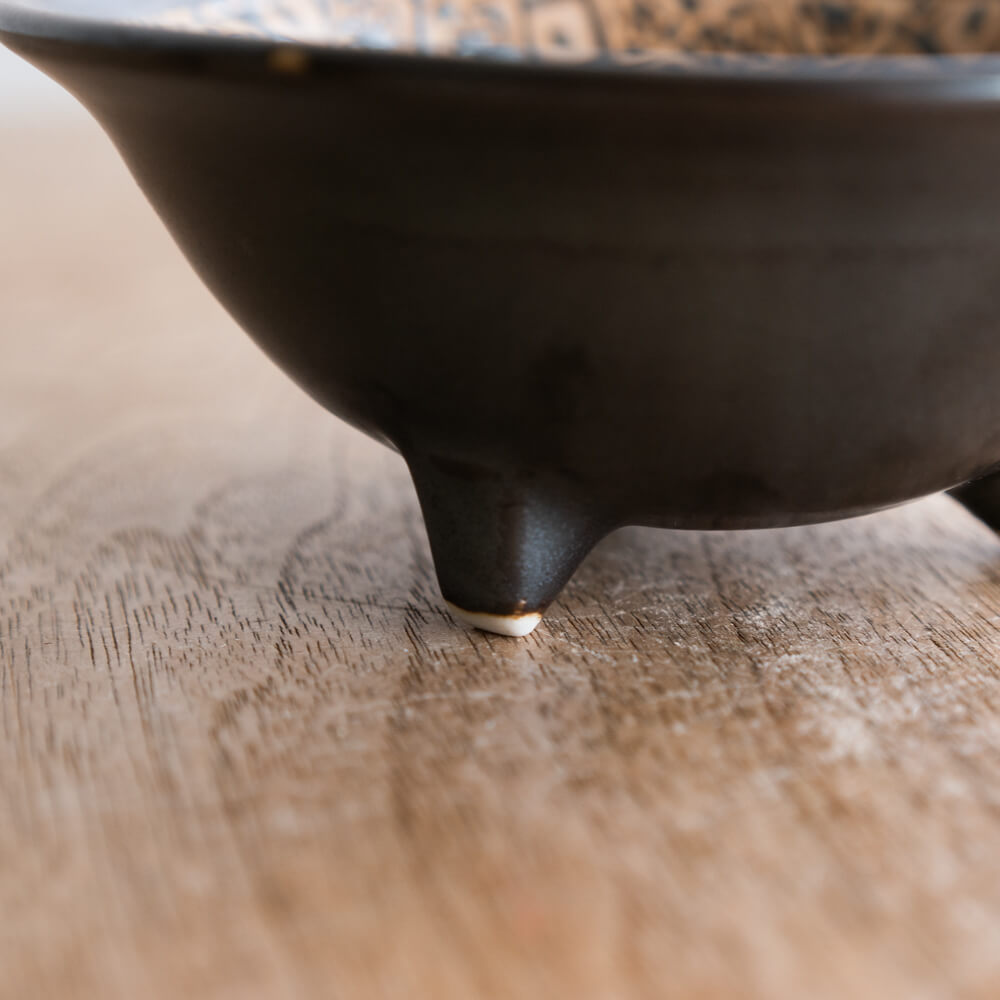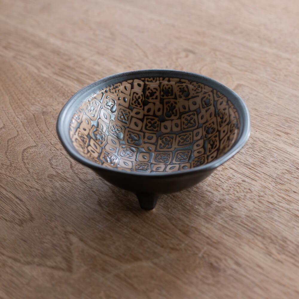黒釉の静かな光沢と、可憐に並ぶ花カノコ模様。手のひらに収まる小さな器の中に、職人の丁寧な手仕事と遊び心が宿っています。三つ足のフォルムが生み出す陰影は、食卓に軽やかな立体感を添えます。