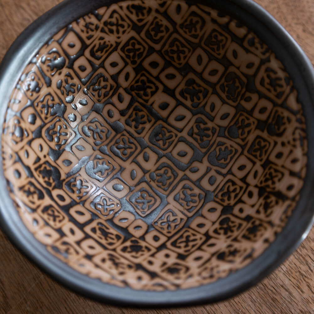 内側いっぱいに描かれた花カノコ模様は、まるで布地の刺繍のよう。釉薬のかかり具合や彫りの深さによって、ひとつひとつに違う表情が生まれます。黒釉の上に浮かぶベージュの文様が奥行きをつくり、光を受ける角度でほんのり艶めきます。