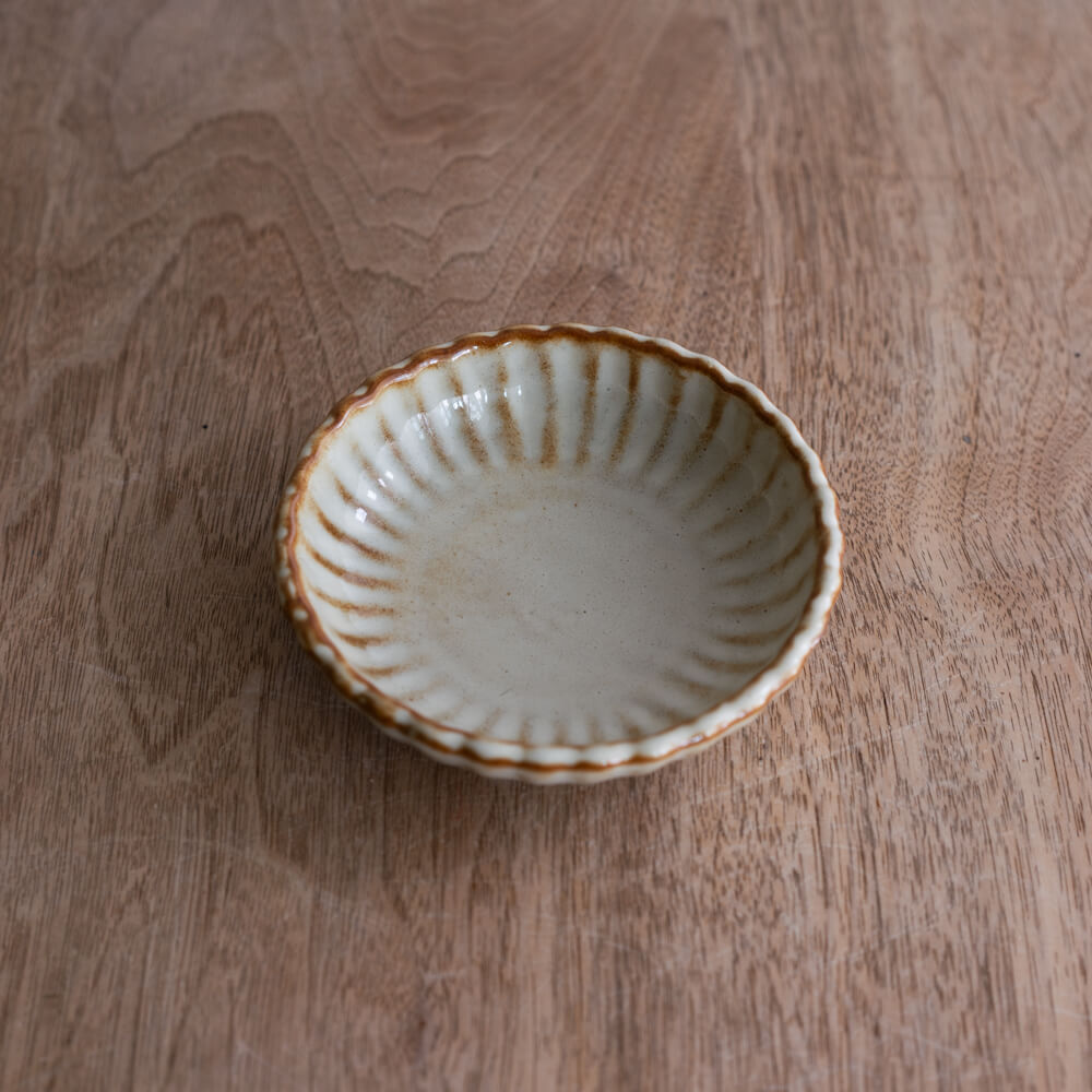 ほんのりと茶を帯びた縁の景色が、どこか懐かしい趣を感じさせる菊型の小皿。手のひらにすっと収まるサイズ感で、毎日の食卓にそっと寄り添う一枚です。和にも洋にも馴染む自然な風合いが、料理をやさしく引き立てます。