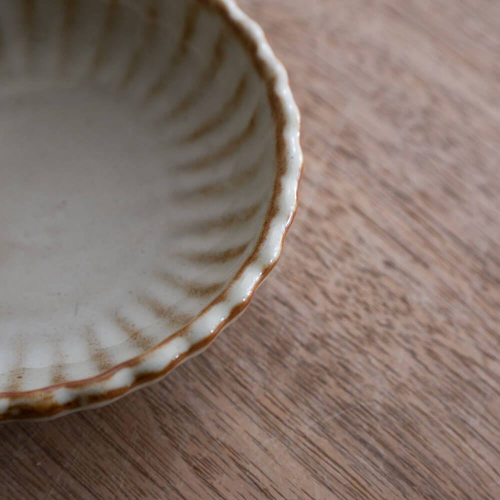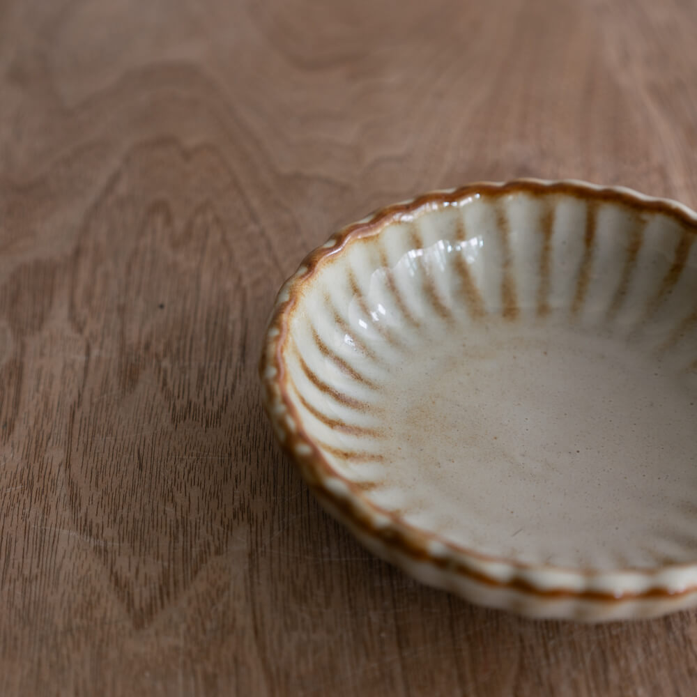 放射状に広がる菊型の凹凸が、光をやさしく受け止め、陰影の美しい表情を生みます。縁にはわずかに焦げたようなサビ釉が重なり、料理を一層引き立てる“余白の美”を感じさせます。