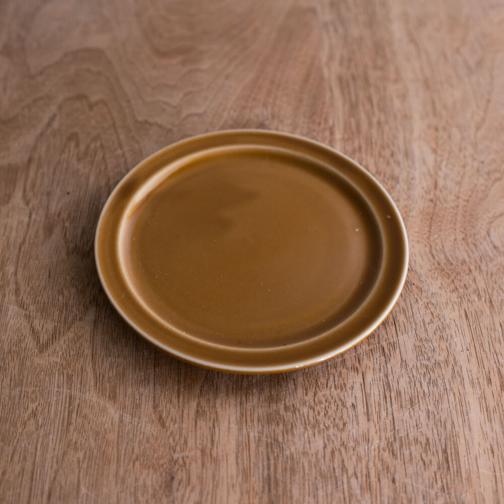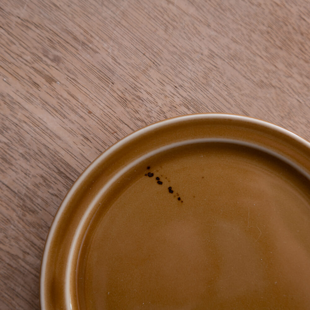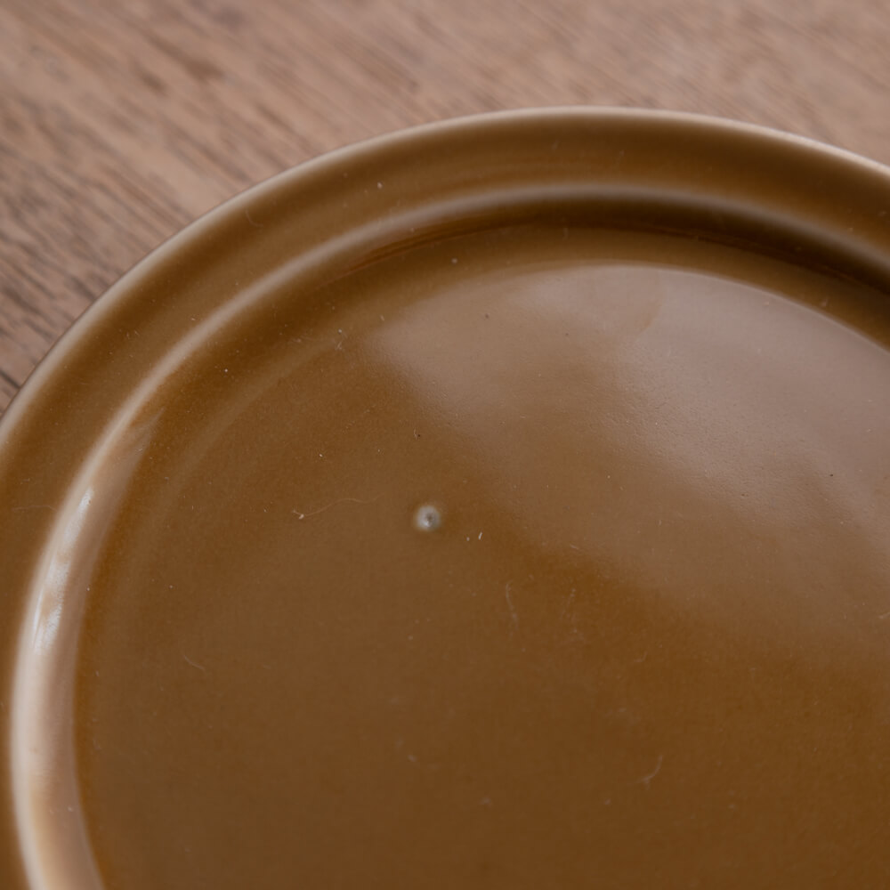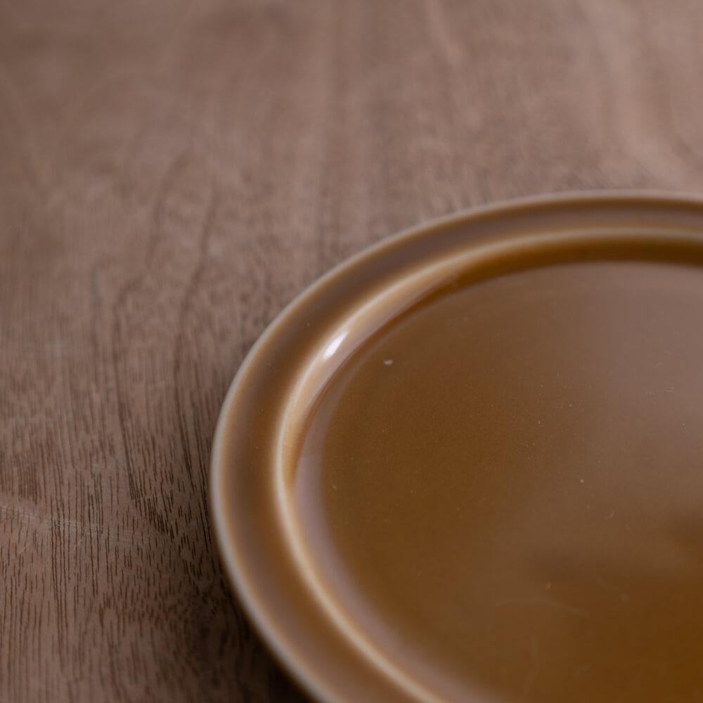 ほんのり黄みを帯びたブラウンに、うっすらと白が縁取るリムデザイン。落ち着いたトーンの中に優しい艶があり、料理の彩りを引き立ててくれる一枚です。13.8cmという手のひらサイズは、取り皿やデザート皿として使いやすく、和にも洋にもなじむ万能プレートです。