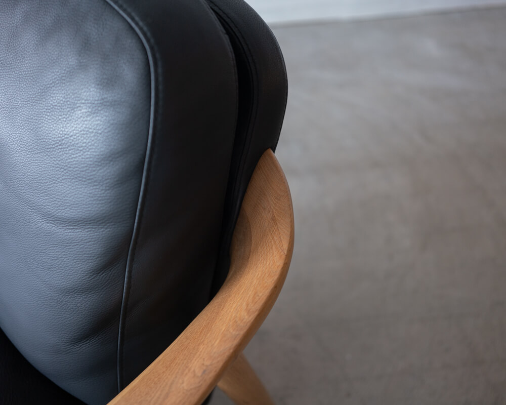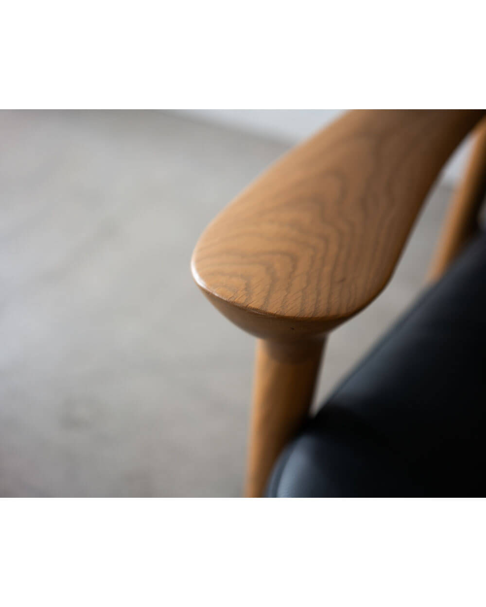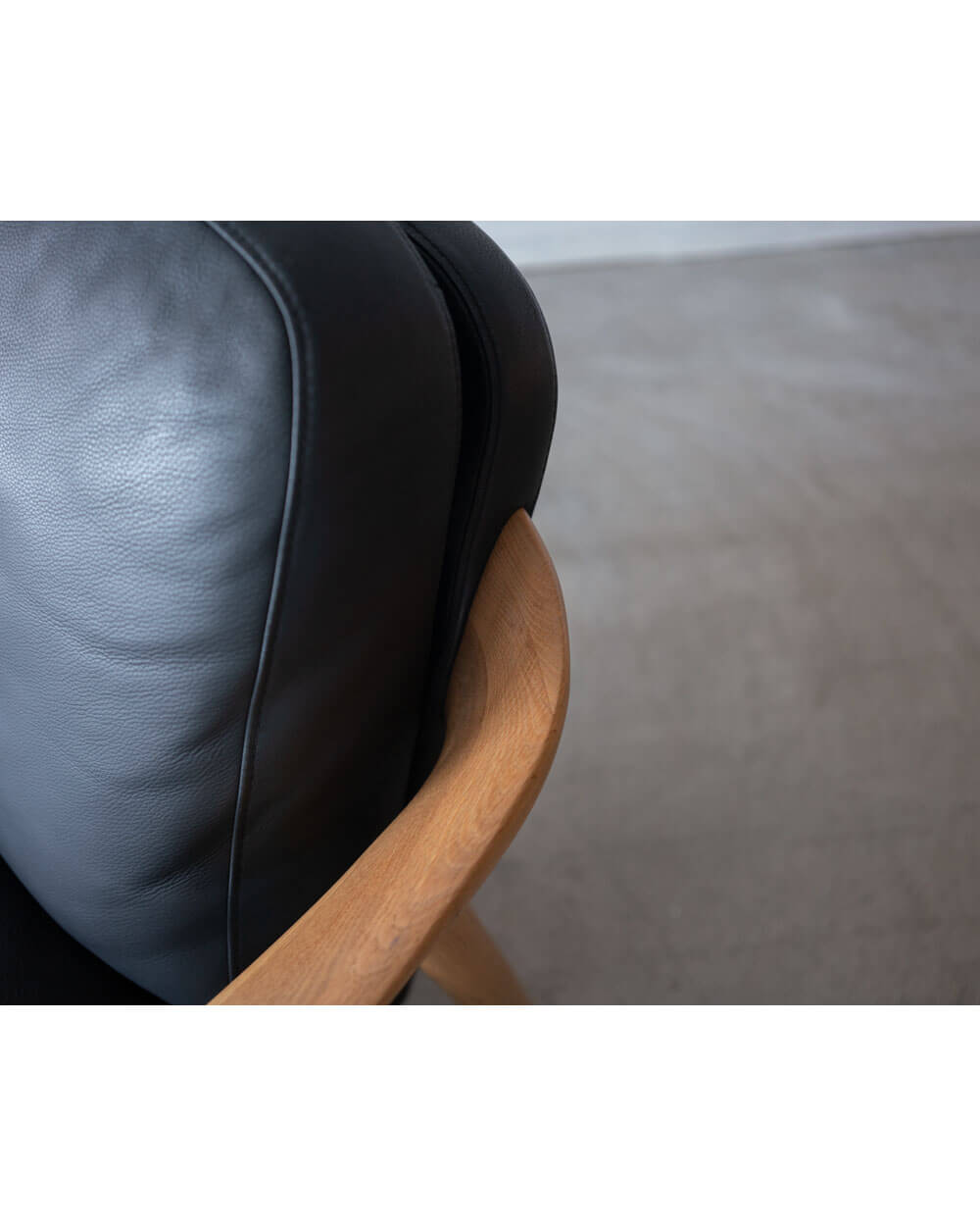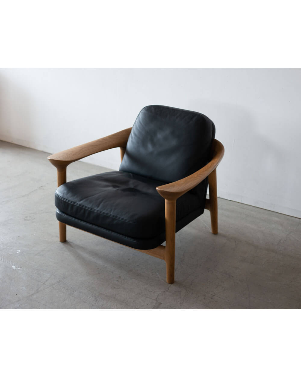A. 木と革、職人の手仕事が生み出す“静かな贅沢”。座るたびに深呼吸したくなるような、上質な一人掛けソファです。