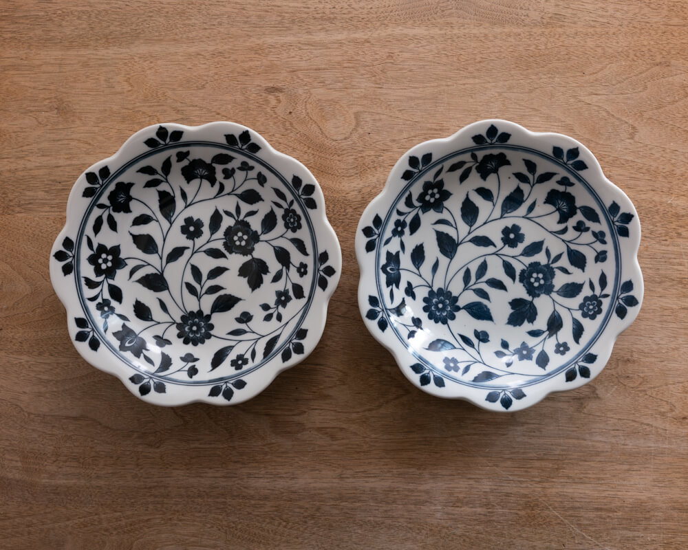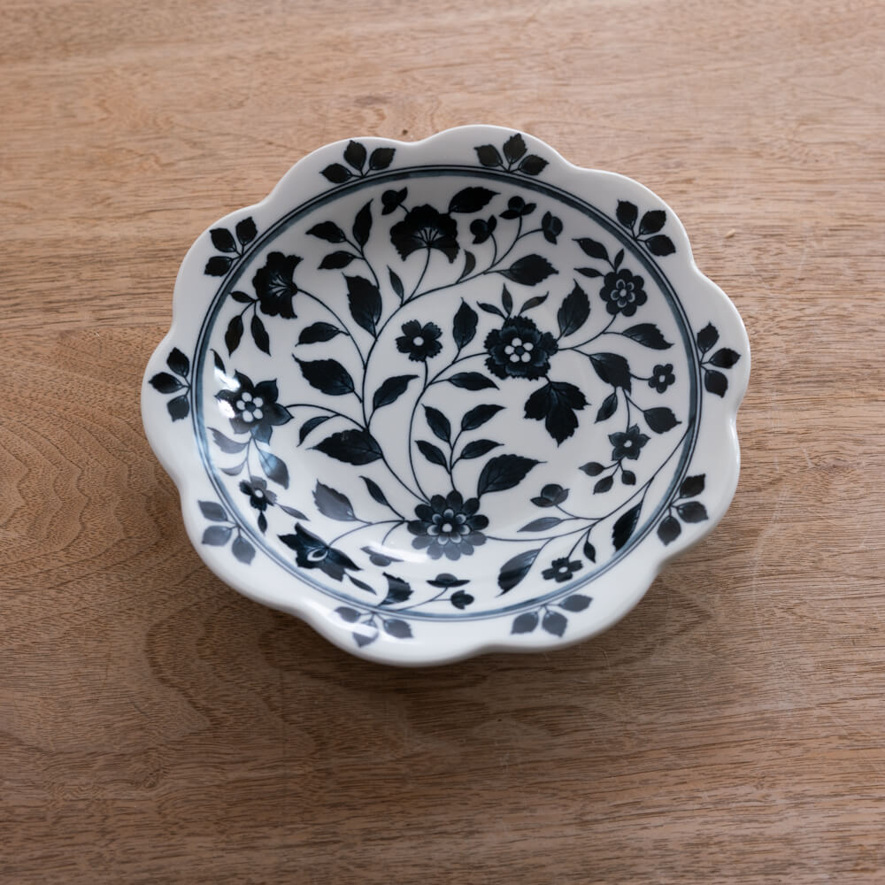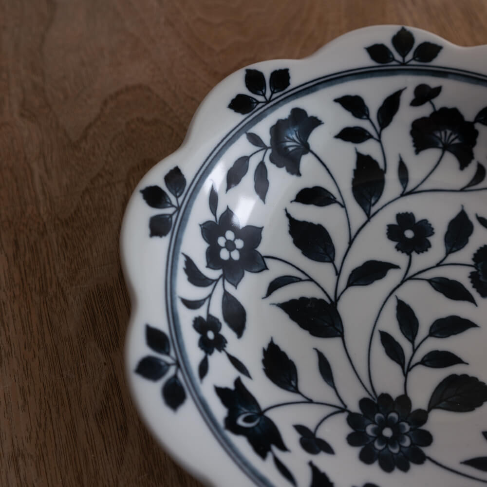 白磁の上に、深い藍で描かれた花々。柔らかな波形の縁が、まるで花びらのように食卓を包み込みます。清楚で上品な佇まいながら、普段使いにも馴染む懐の深さが魅力です。