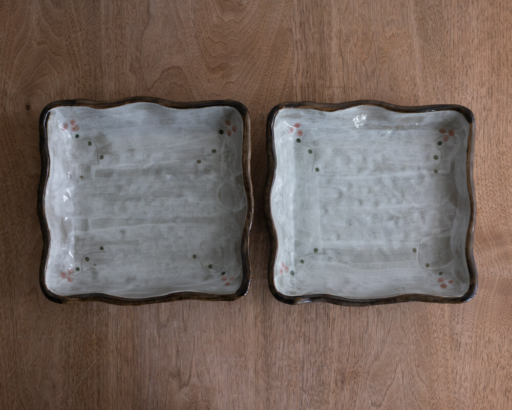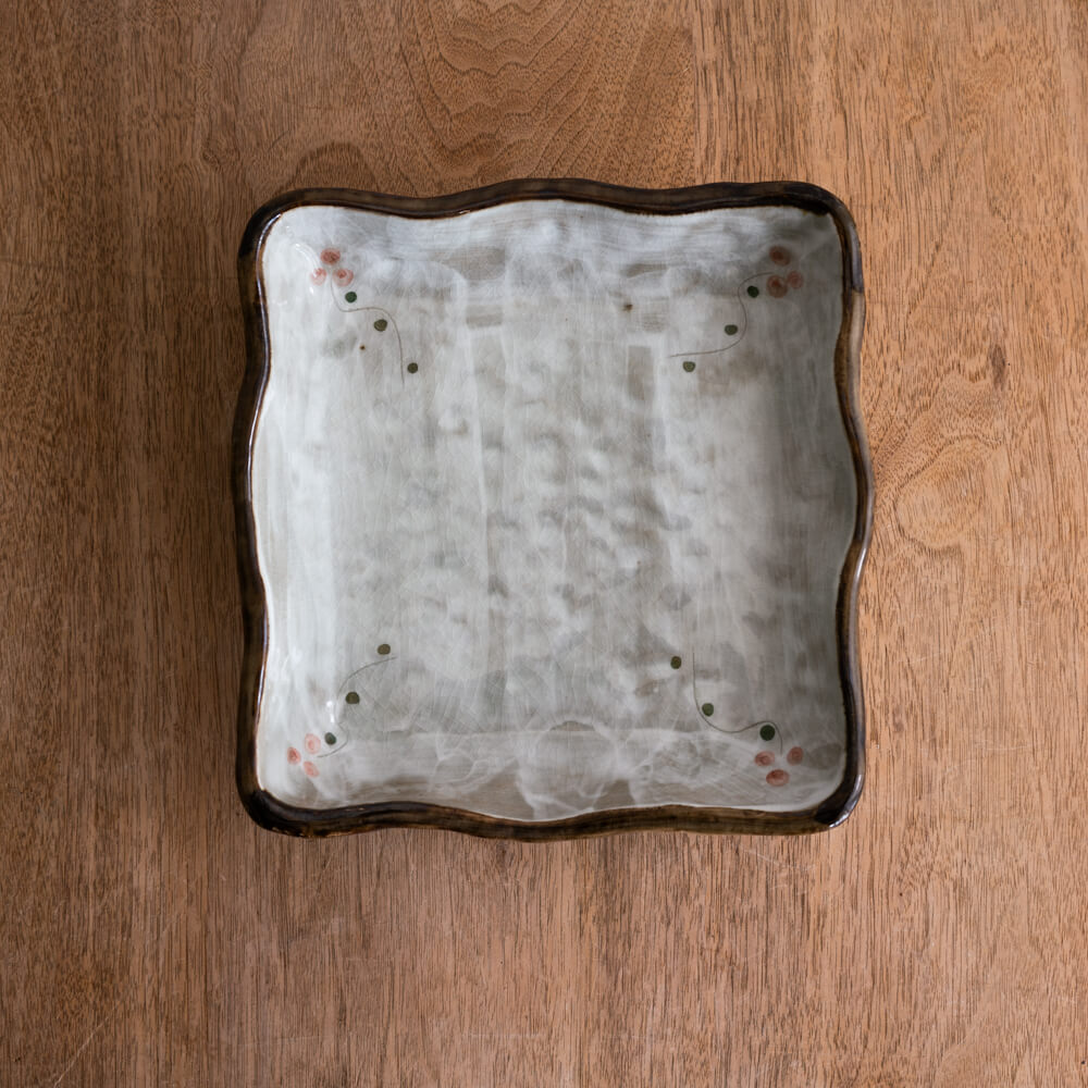 21cm角のほどよい大きさは、和菓子・果物・おつまみなど幅広く活躍。深さがあるため汁気のある料理にも使えます。普段使いはもちろん、おもてなしの席でも映える一枚です。