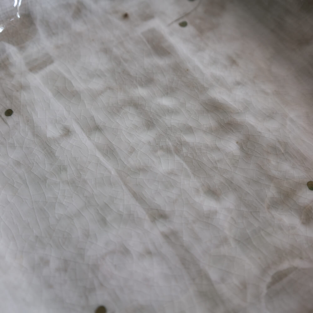 透明感のある白釉に浮かぶ、繊細なひび模様。これは「貫入(かんにゅう)」と呼ばれる自然現象で、焼成後の冷却時に生じる釉薬の微細なひび。器ごとに異なる“景色”として、長く使うほどに味わいを増していきます。