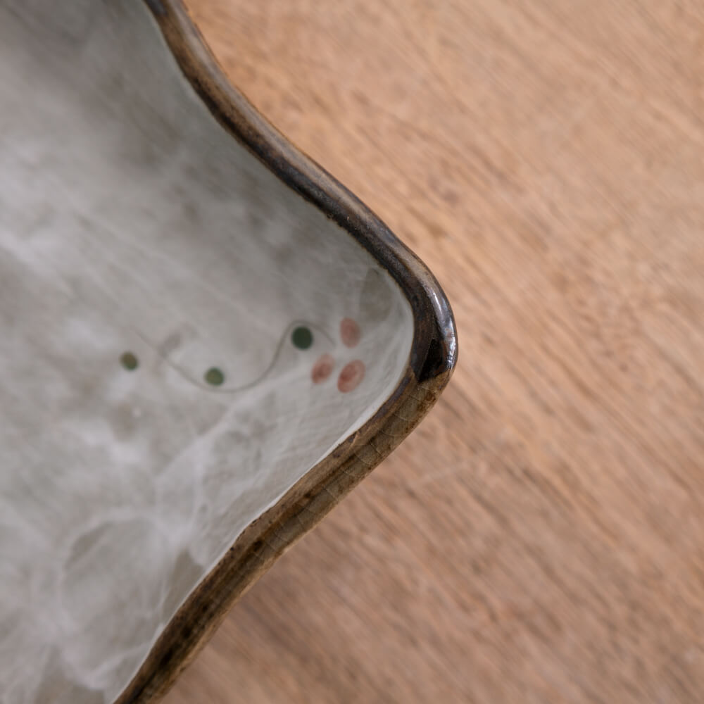 柔らかな白釉の上に小さな木の実をあしらった、やさしい雰囲気の角型菓子鉢。和食器らしい落ち着きの中に、どこか愛らしさを感じる一枚です。