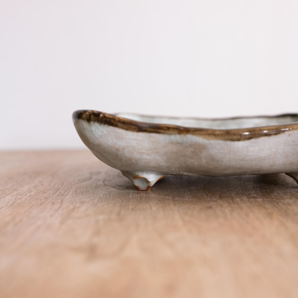 この器を印象づけているのが、深みのある焦げ茶の縁。釉薬を厚く施し、焼成中に流れた釉がわずかに溜まることで、自然な濃淡が生まれます。まるで額縁のように中央を引き締め、料理の彩りをより引き立てる効果があります。“縁を太くする”というのは昔からの日本の技法で、器の「重心を安定させる」ためでもあります。光が当たると縁の部分が艶やかに光り、静かなコントラストを描きます。
