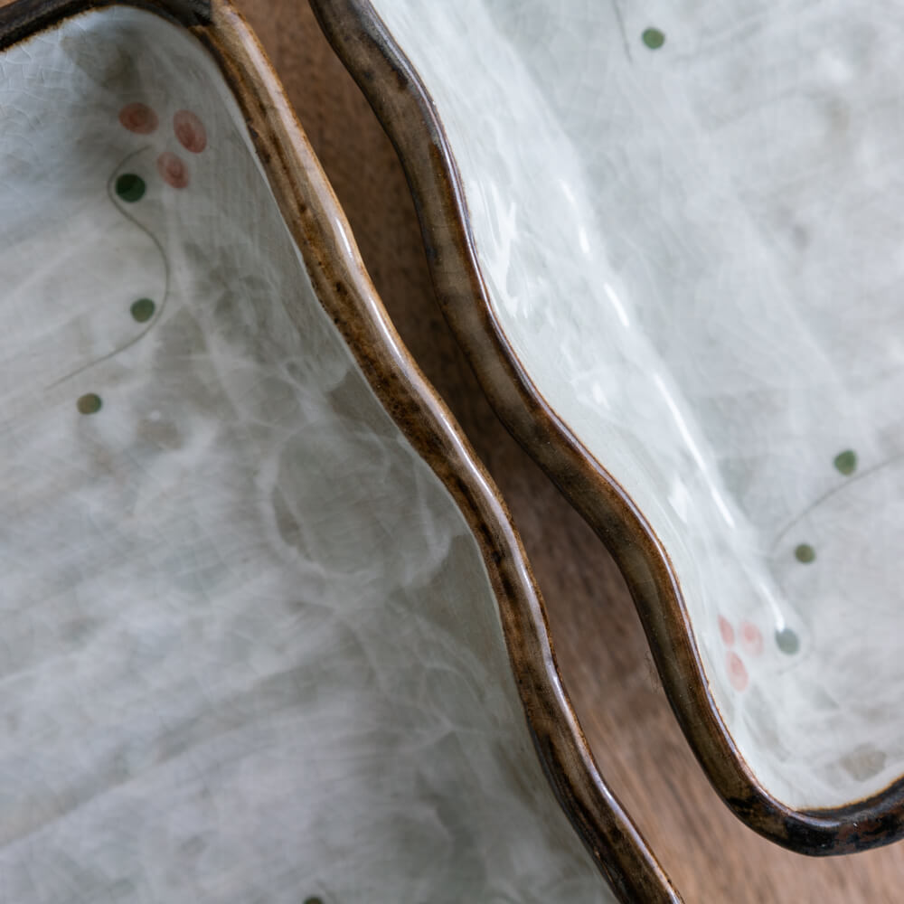 四隅に描かれた朱と緑の小花のような実。控えめながら、器全体に生命感を添えるポイントです。お菓子や果物を盛ると、絵付けがさりげなく顔を出し、季節を感じる演出にも。
