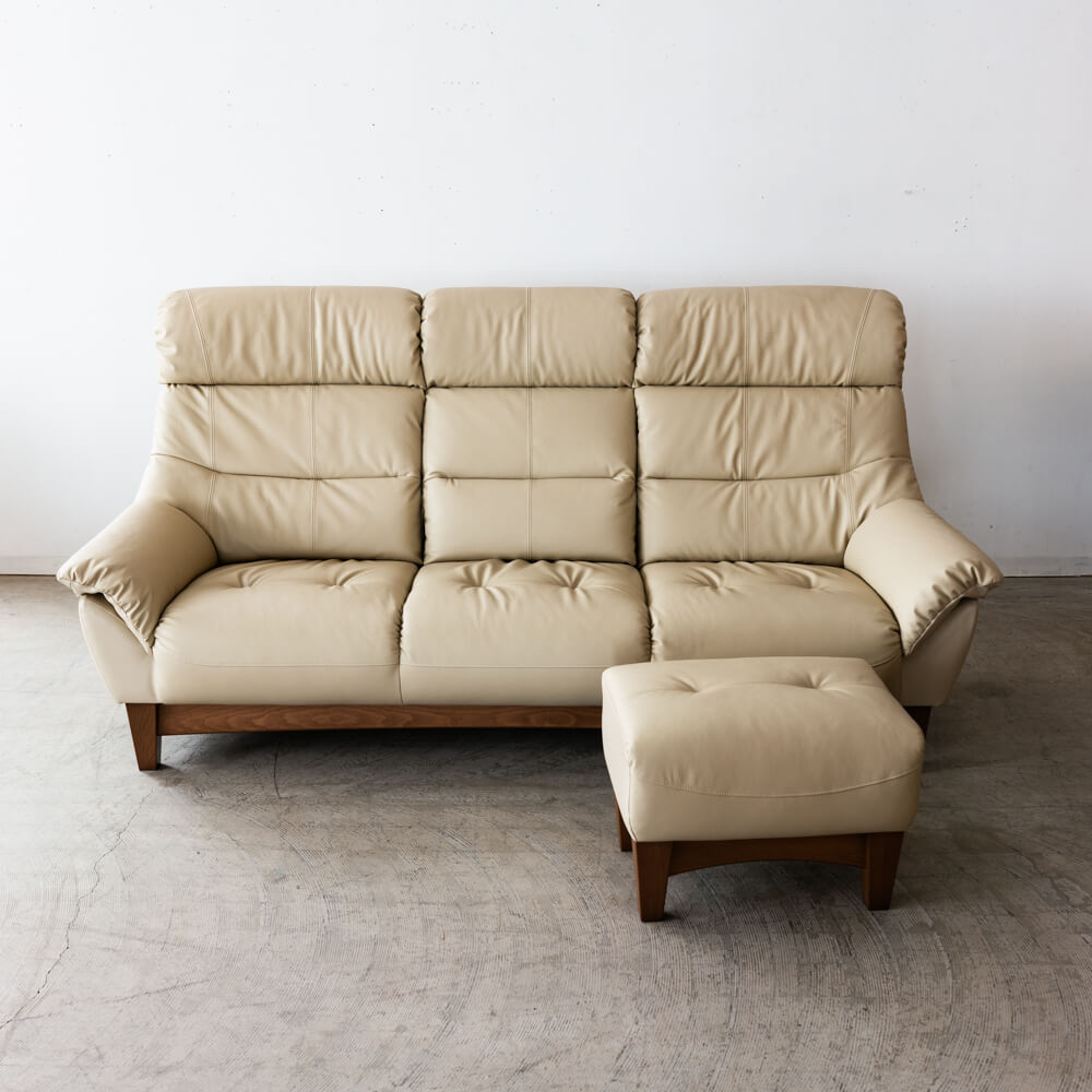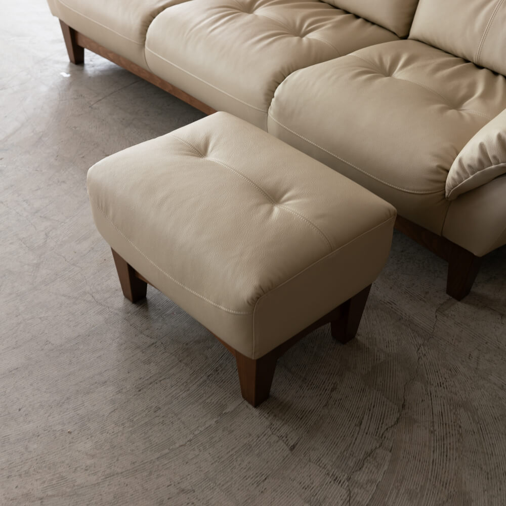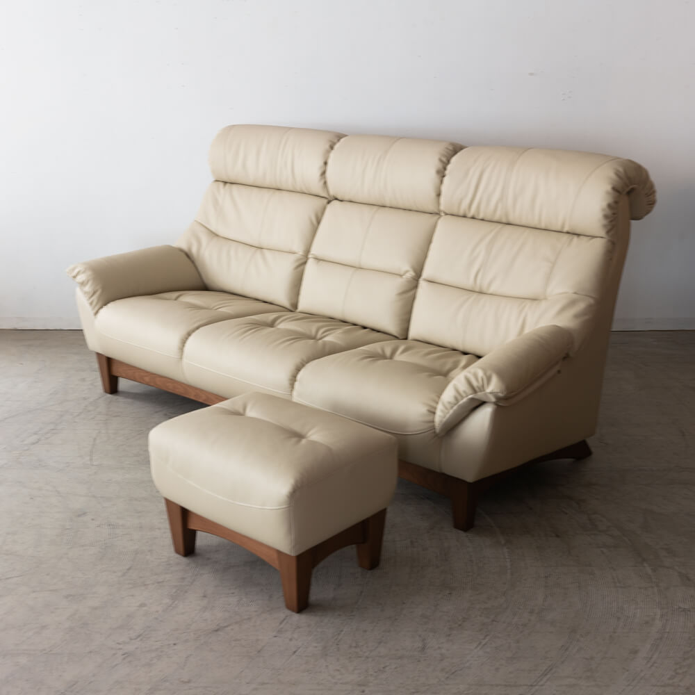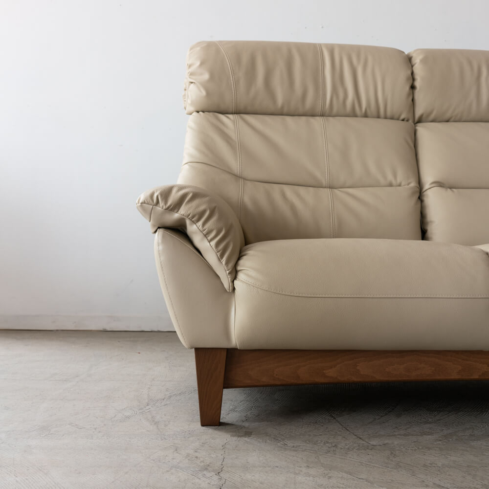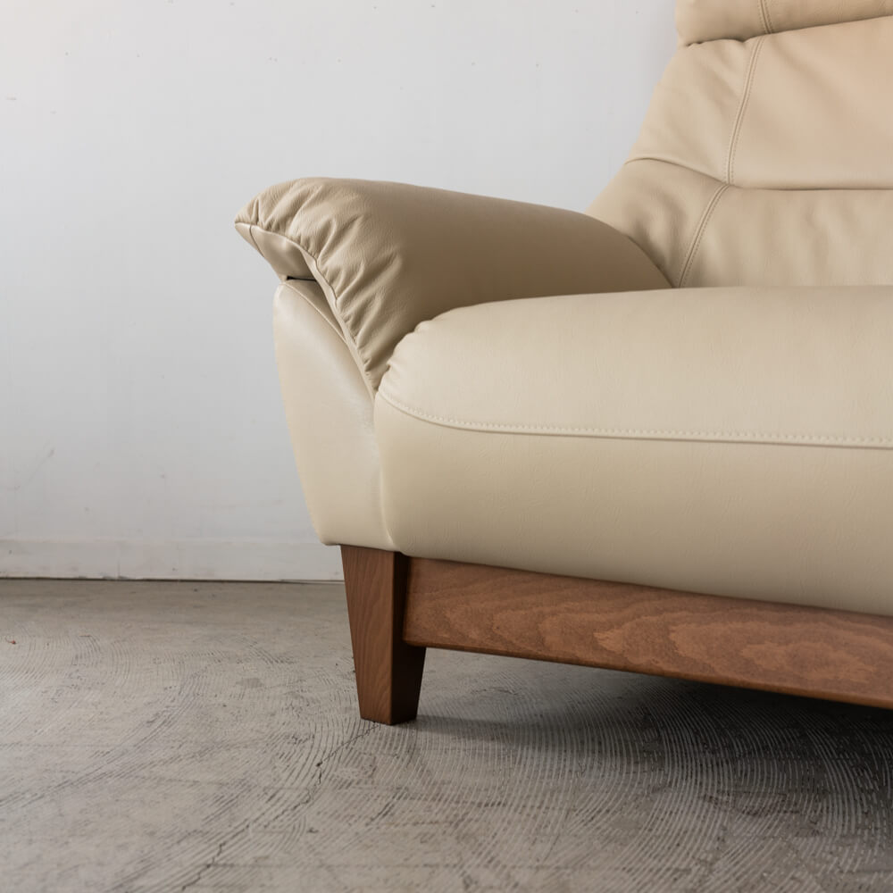 上質な本革(一部合成皮革)を贅沢に使用。使うほどに柔らかく手に馴染み、自然な艶を帯びていくのが魅力です。ベージュの革色は空間に優しく溶け込み、木部のウレタン塗装脚と美しく調和。リビングを上質なくつろぎの場へと変えてくれます。