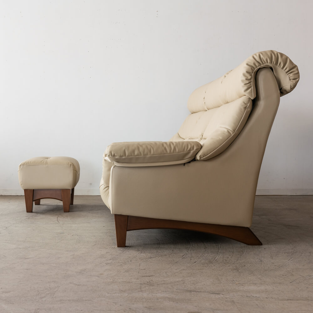 付属のオットマンを合わせれば、足を伸ばしてゆったりと。来客時には簡易スツールとしても使え、レイアウト自由度の高さも魅力です。