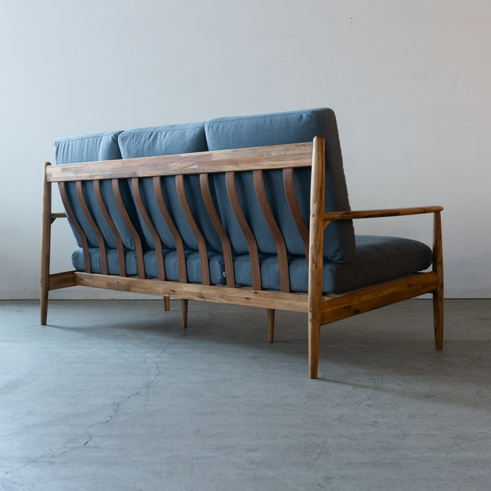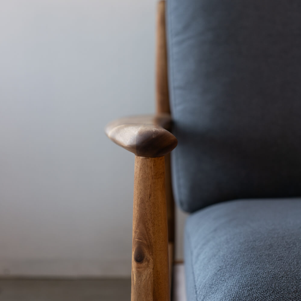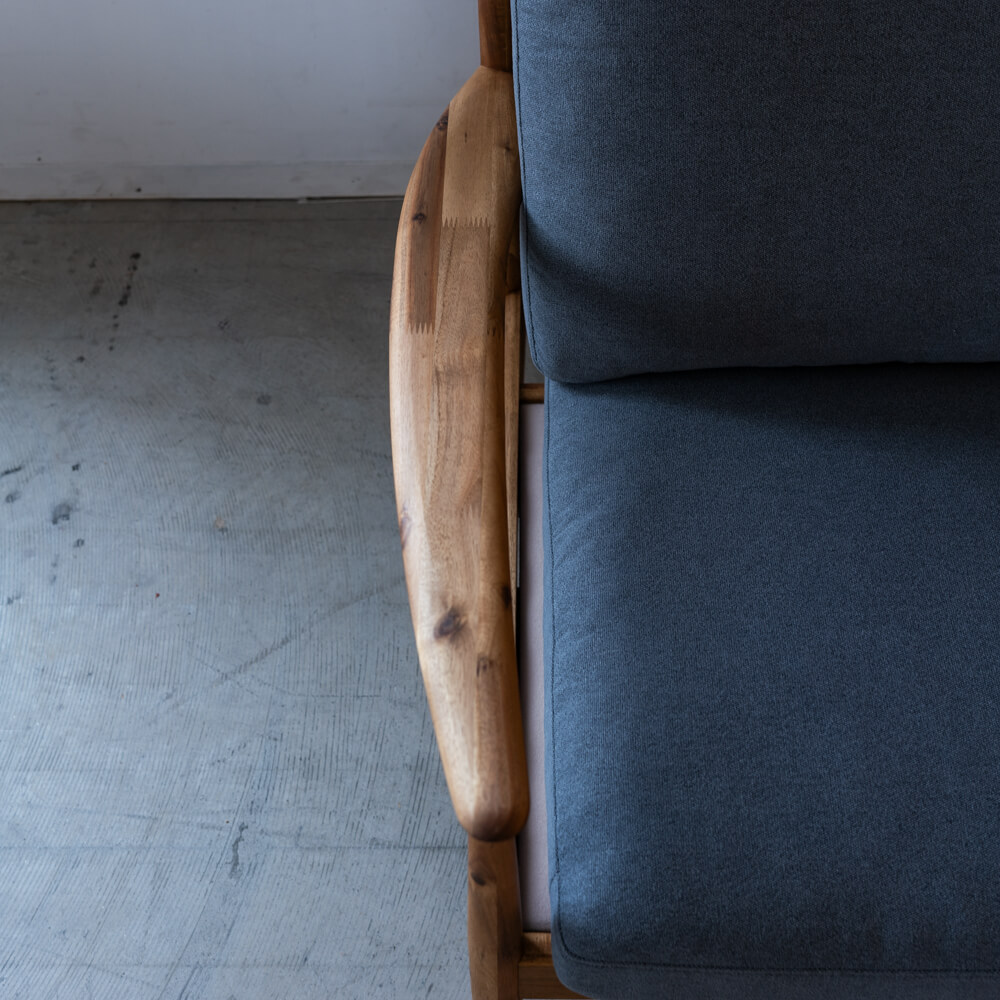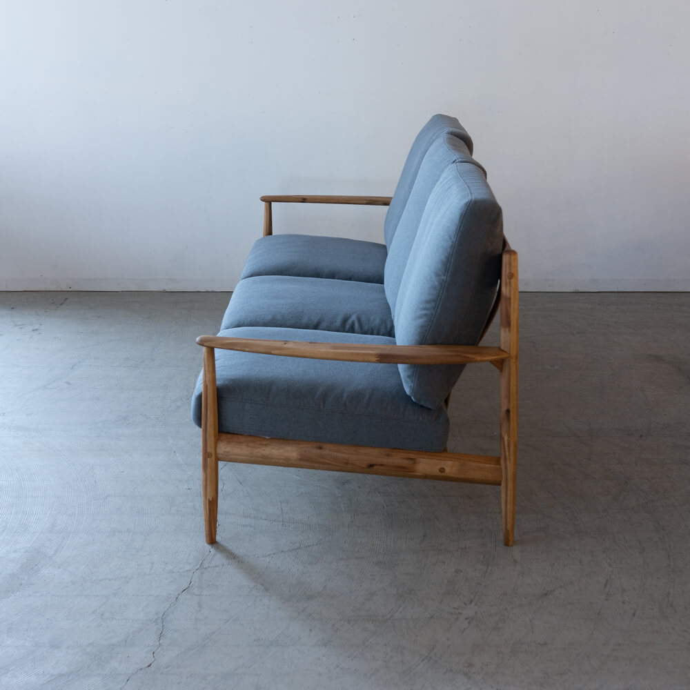 淡いブルーグレーのファブリックと、アカシア無垢材のあたたかなフレームが調和した「EDDA 3Pソファ」。北欧ヴィンテージの空気感を取り入れながら、日本の住空間にすっと馴染むコンパクトな設計です。どの角度から見ても軽やかで美しく、空間に“上質な透明感”をもたらします。