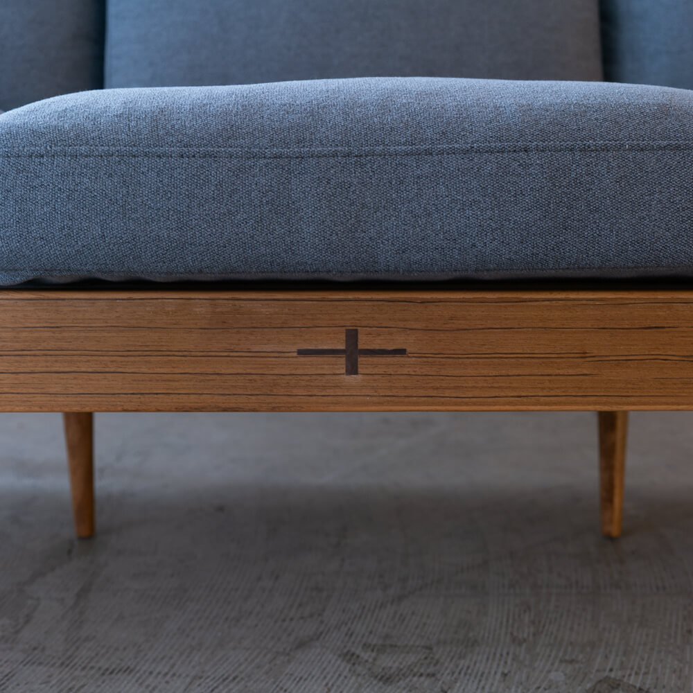 正面のベース中央には、十字の象嵌細工が施され、職人の繊細な手仕事が息づくディテールに。天然オイルで仕上げられた木肌からは、木の香りと温もりが静かに漂います。