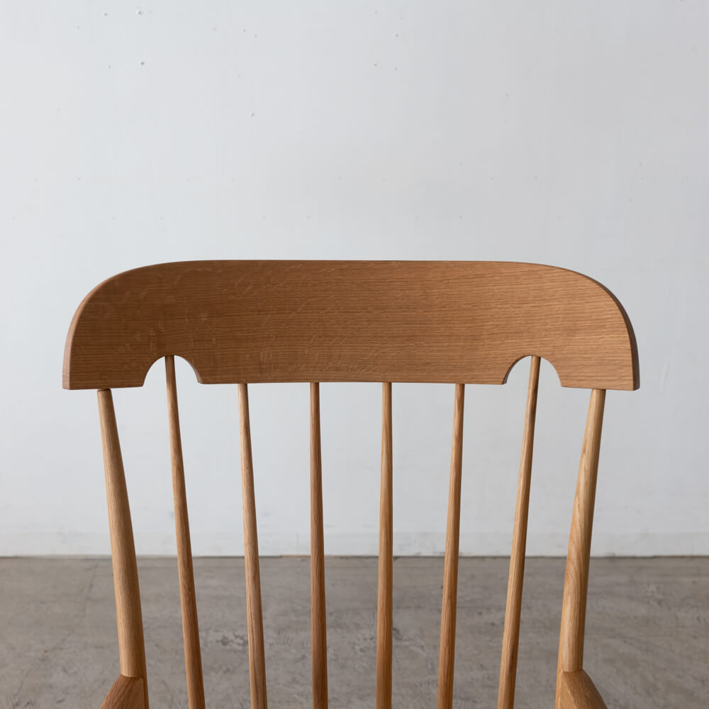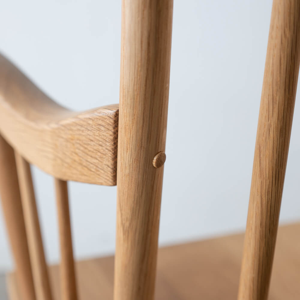 高く伸びるスポークと緩やかに反った背板が、背中全体をやさしく受け止めるように設計されています。包み込まれるような座り心地と、美しいシルエットを両立しています。