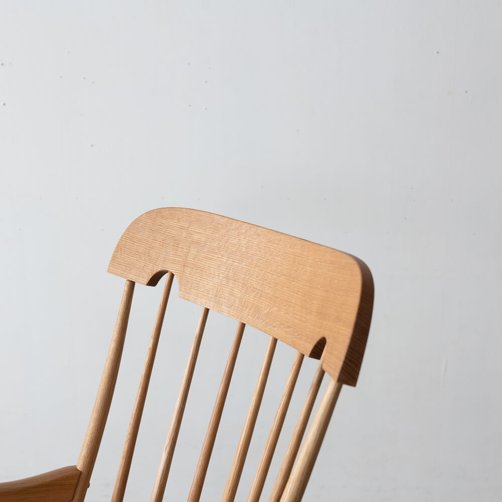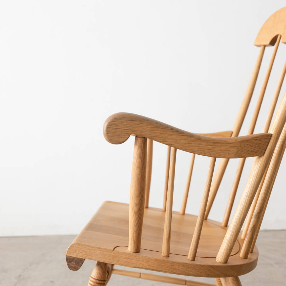 繊細にカーブを描く脚部が生み出す心地よい揺れは、まるで自然のリズムに身を委ねるような穏やかな時間をもたらします。リビングや読書スペースに置くだけで、空間の“静けさ”が整うような存在です。