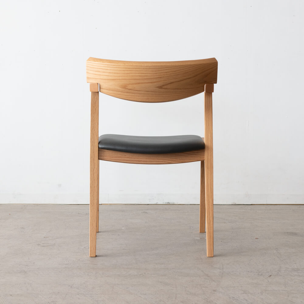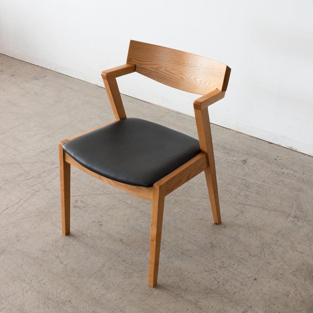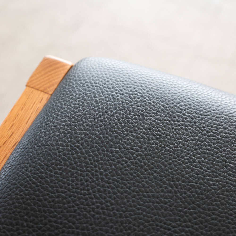 座面には、しっとりとした質感のブラックPVCレザーを採用。柔らかすぎず、しっかりと体を支える絶妙な弾力。お手入れも簡単で、ダイニングでの食事シーンにも安心して使えます。