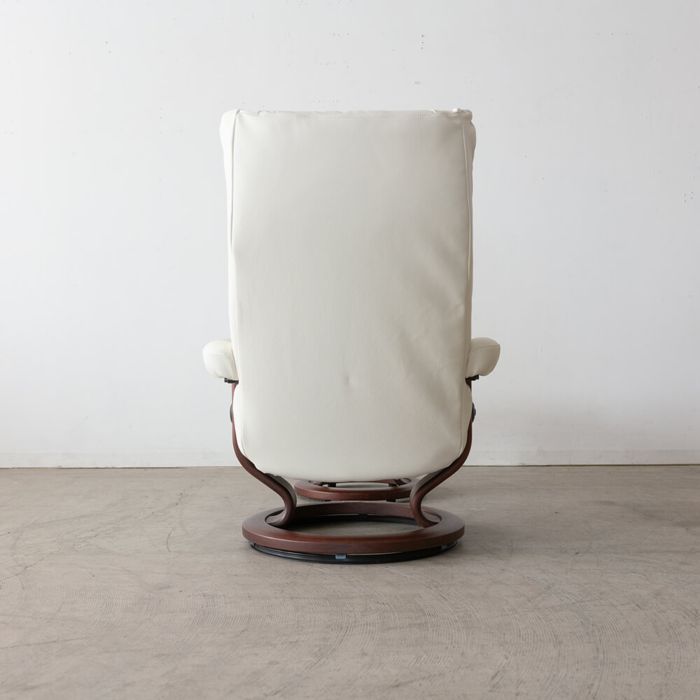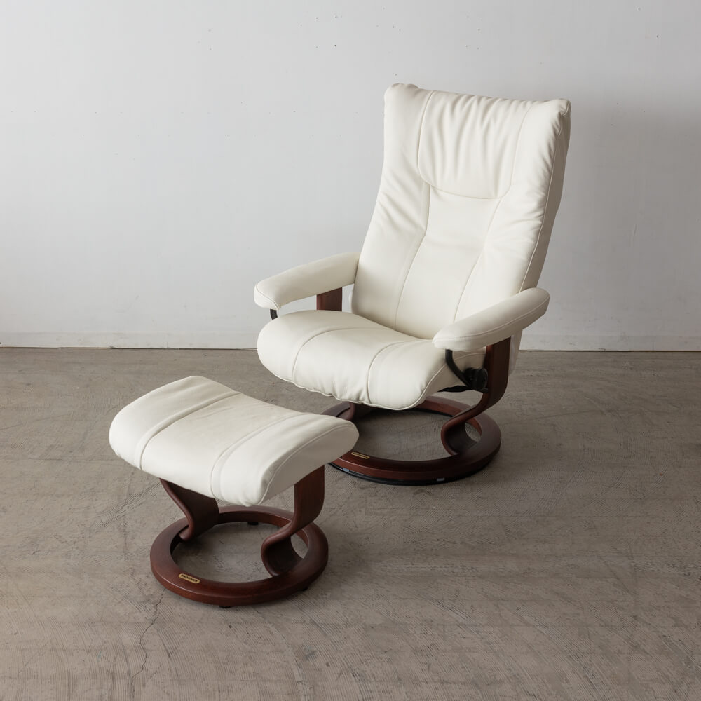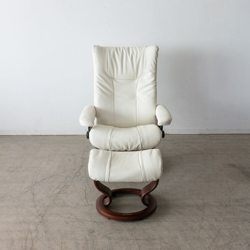 ノルウェーの家具ブランド「エコーネス」が生んだストレスレスチェア。その快適な座り心地と機能美は、時を経てもなお色あせません。この一脚は、前の暮らしから受け継いだ椅子を当店で丁寧に張り替え、新しい革の質感とともに、再び心地よい時間をお届けします。