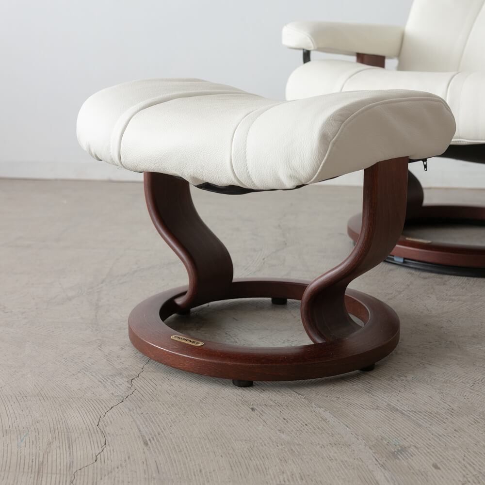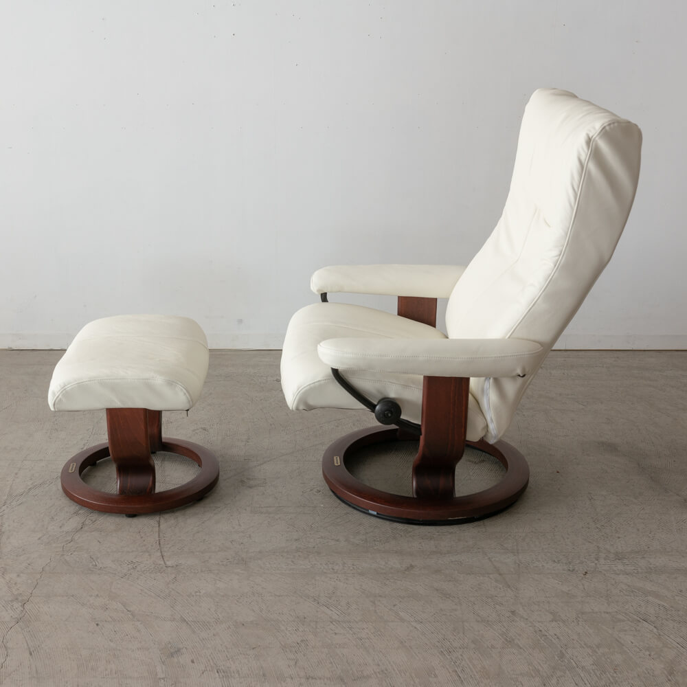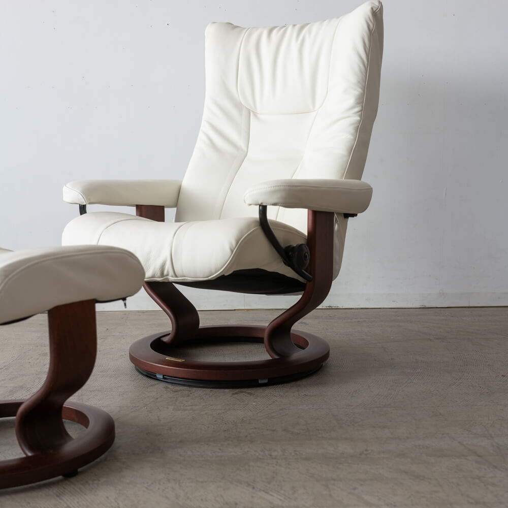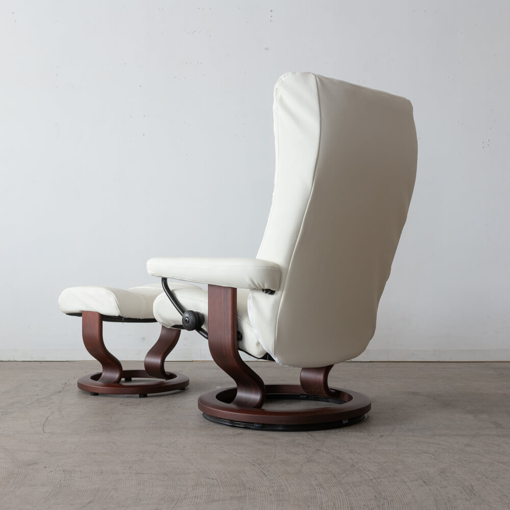 ノルウェーの家具ブランド「エコーネス」が生んだストレスレスチェア。その快適な座り心地と機能美は、時を経てもなお色あせません。この一脚は、前の暮らしから受け継いだ椅子を当店で丁寧に張り替え、新しい革の質感とともに、再び心地よい時間をお届けします。