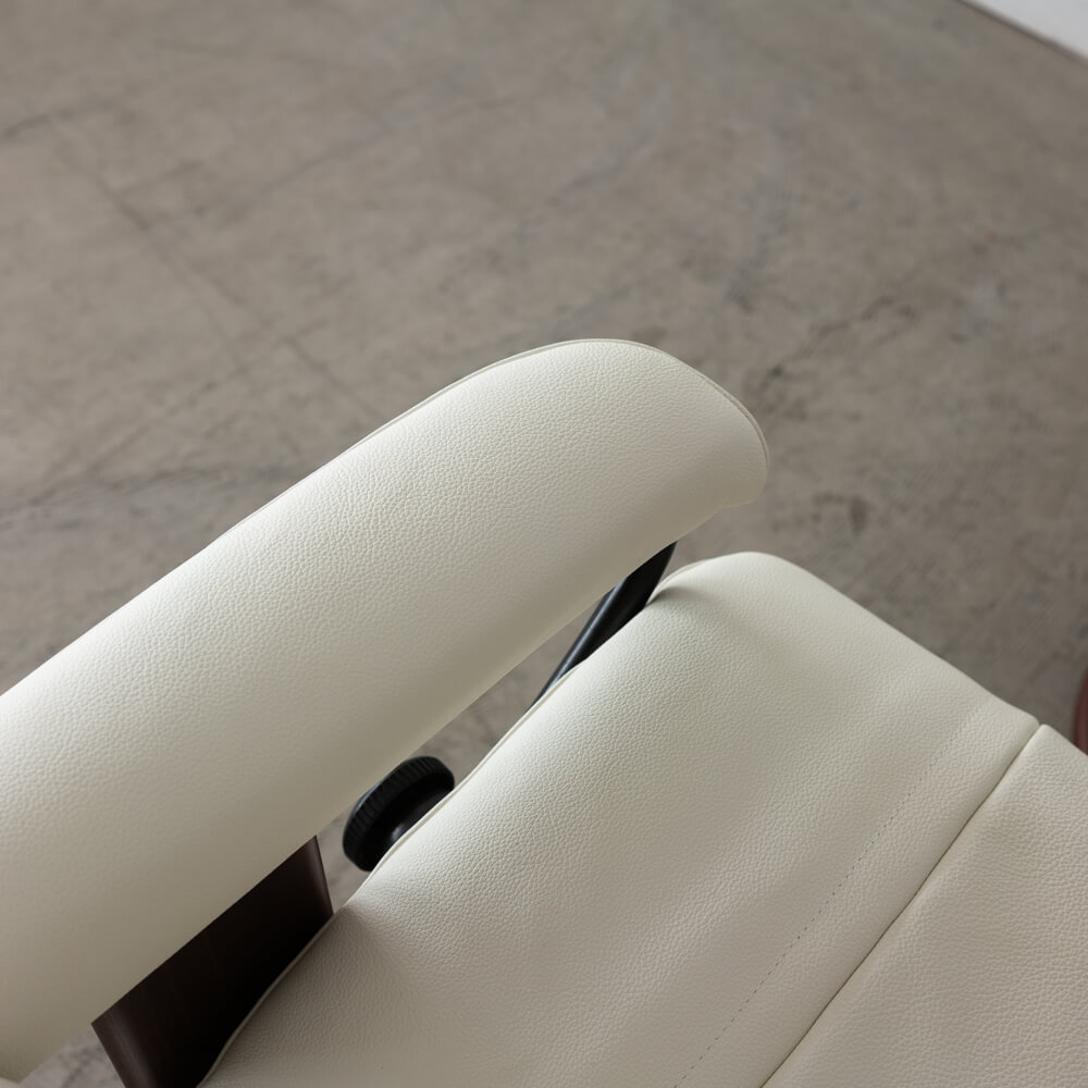 A. ストレスレスチェア特有の「テンションノブ」です。リクライニング時の“かたさ”を調整できるダイヤルで、回すことで背もたれの動きを自分の体重や姿勢に合わせて変えられます。強めにすれば姿勢をキープしやすく、ゆるめればふわっと包み込むような動きに。電動ではないのに滑らかに動く、この機構こそがストレスレスの魅力です。
