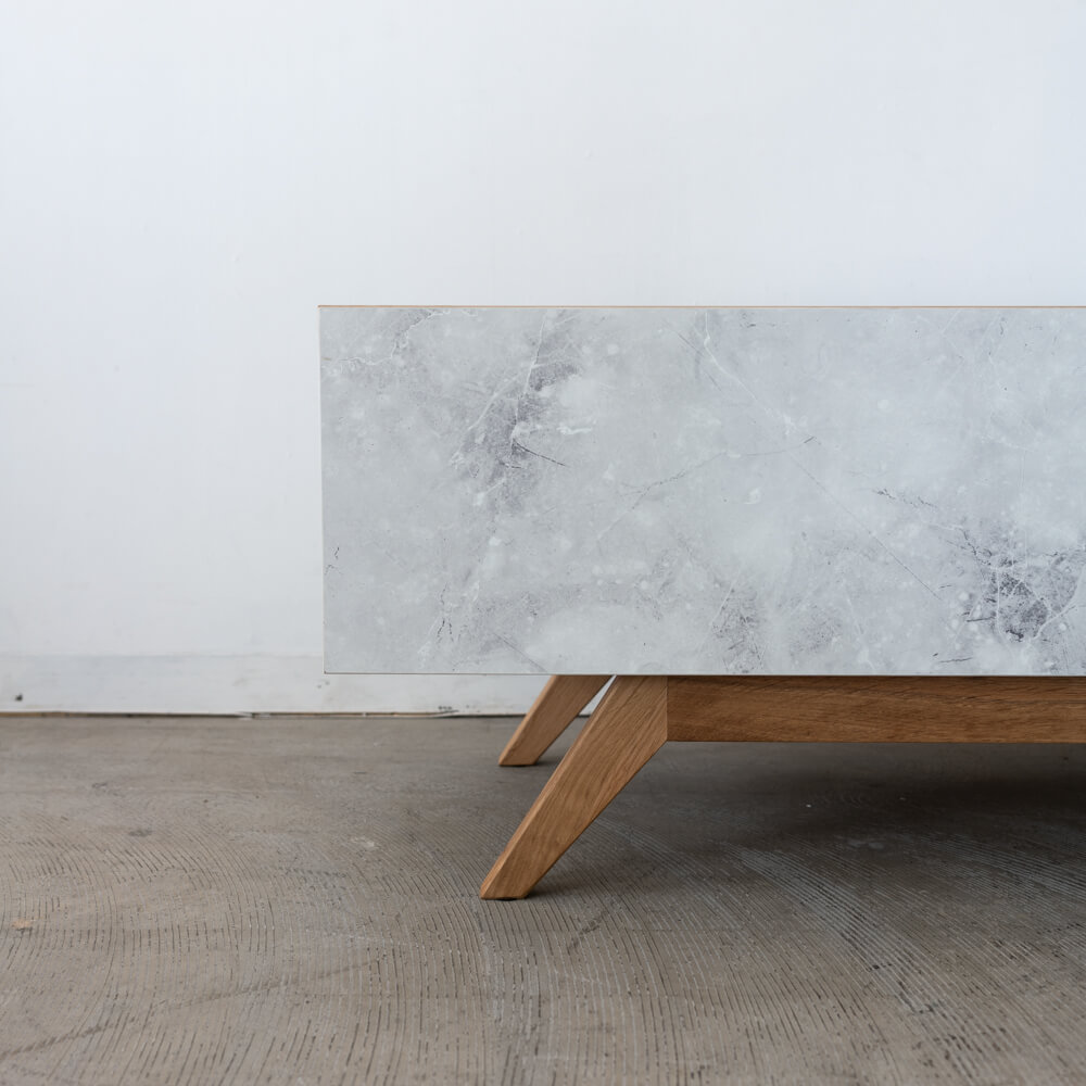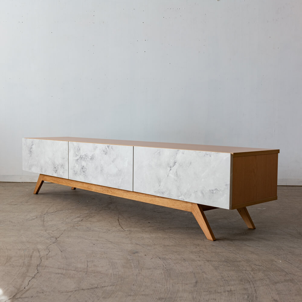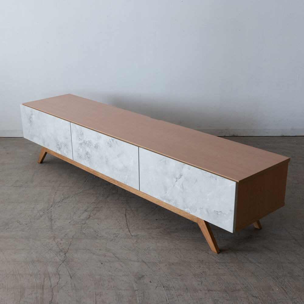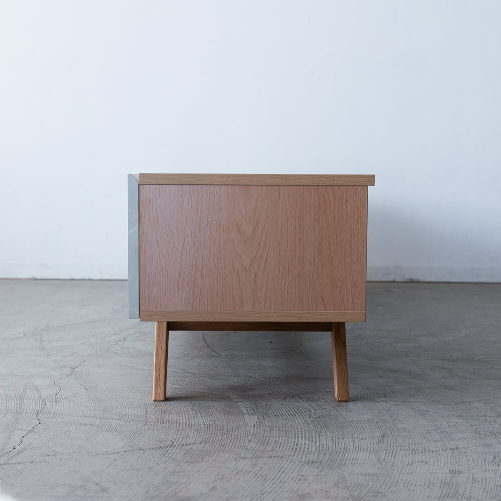 外装不良のため、特別価格で販売中のローボード。大理石調の前板と天然木オーク脚のコントラストが印象的で、リビングに軽やかな抜け感をもたらします。ナチュラルでありながらモダン、上質でありながら親しみやすいデザインです。