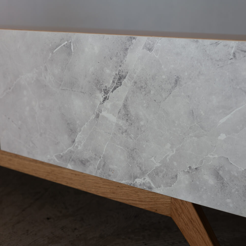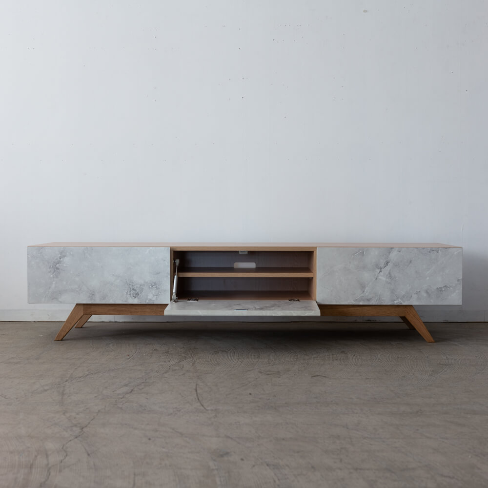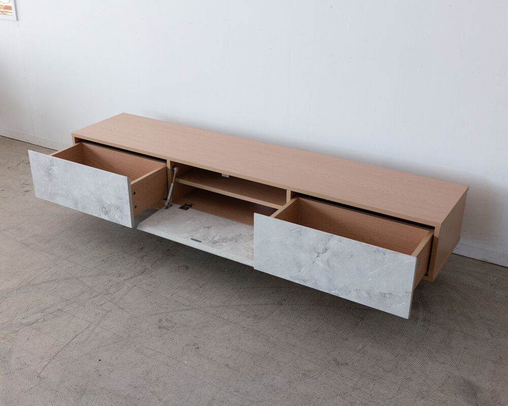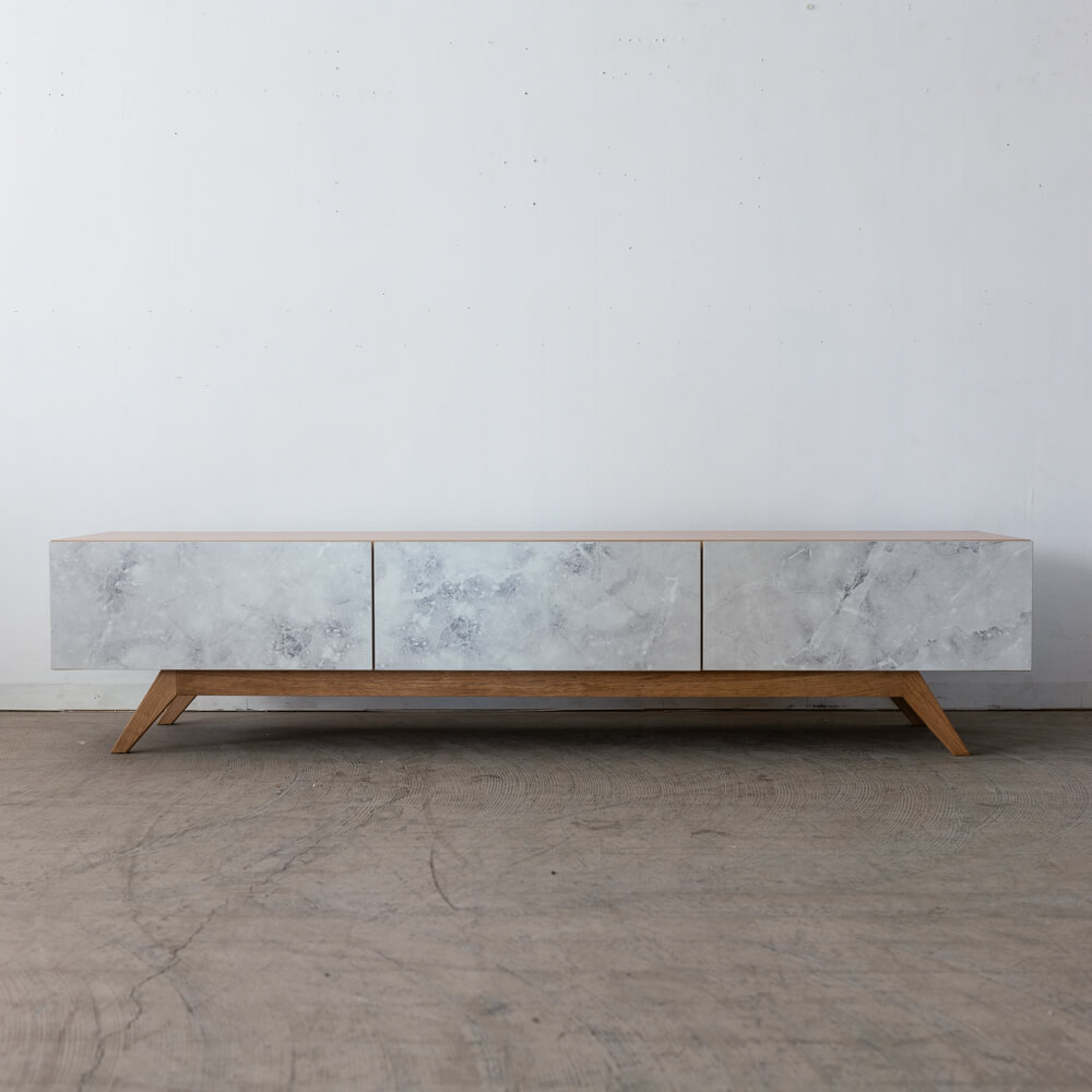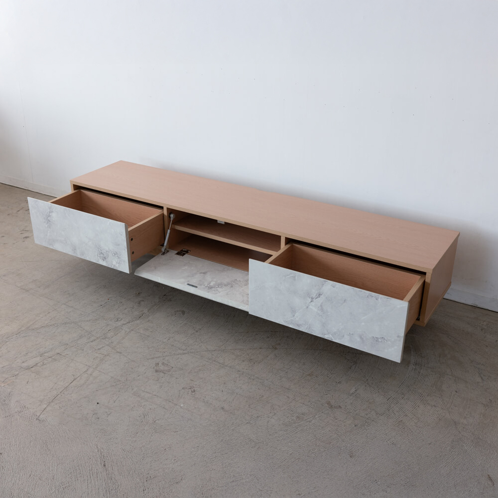 外装不良のため、特別価格で販売中のローボード。大理石調の前板と天然木オーク脚のコントラストが印象的で、リビングに軽やかな抜け感をもたらします。ナチュラルでありながらモダン、上質でありながら親しみやすいデザインです。
