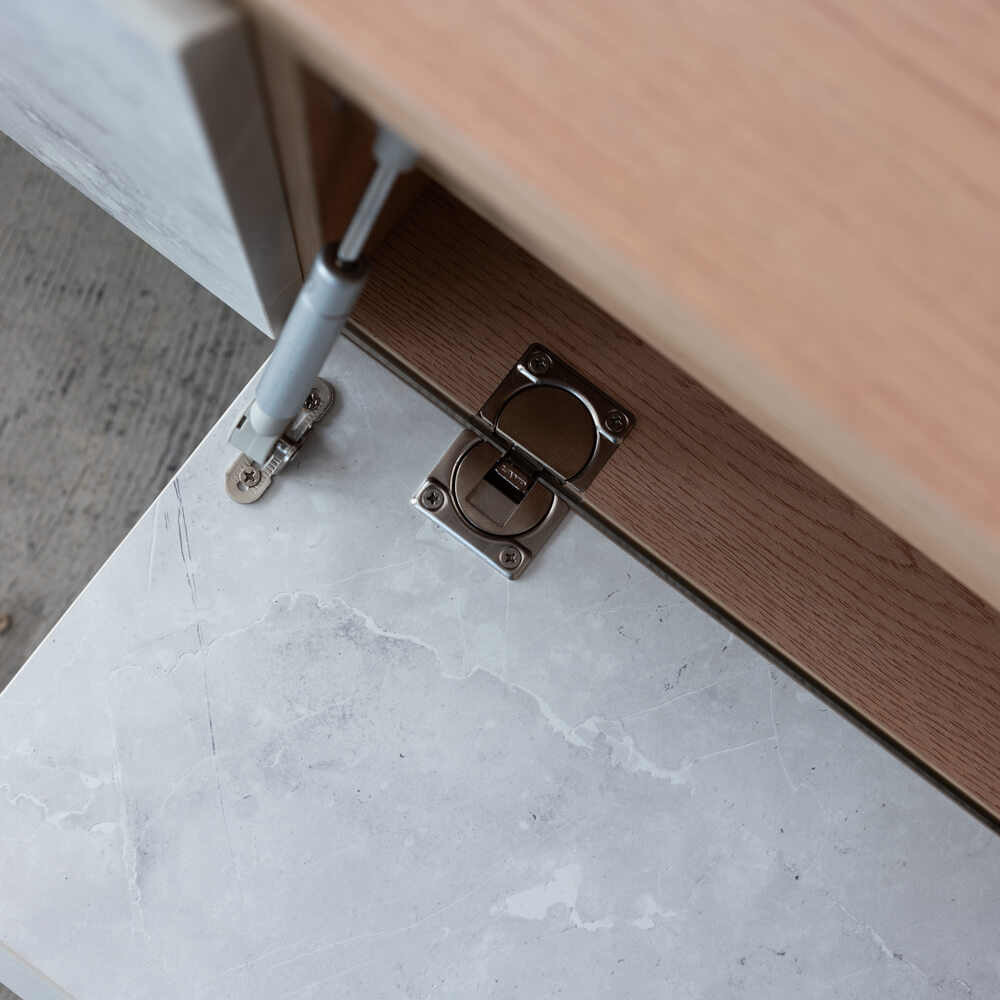 直線的でシンプルな本体に、大理石調のフロントが映えるデザイン。白を基調としたマーブル模様が光を柔らかく反射し、明るく洗練された印象を与えます。北欧・モダン・ナチュラルなど、多様なインテリアに自然と馴染む万能な佇まいです。