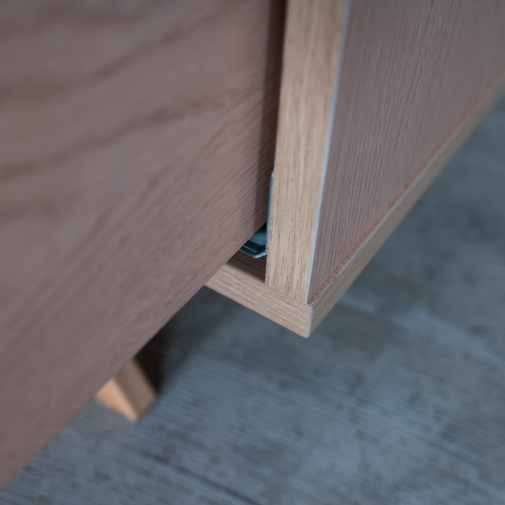 脚部には天然木オーク材を使用。あたたかみのある木肌とシャープな角度の脚ラインが絶妙に調和し、重厚感の中にも軽やかさを感じさせます。脚の高さは、掃除のしやすさにも配慮されています。