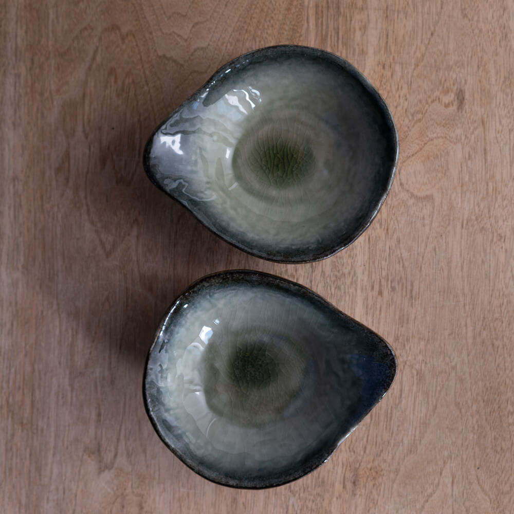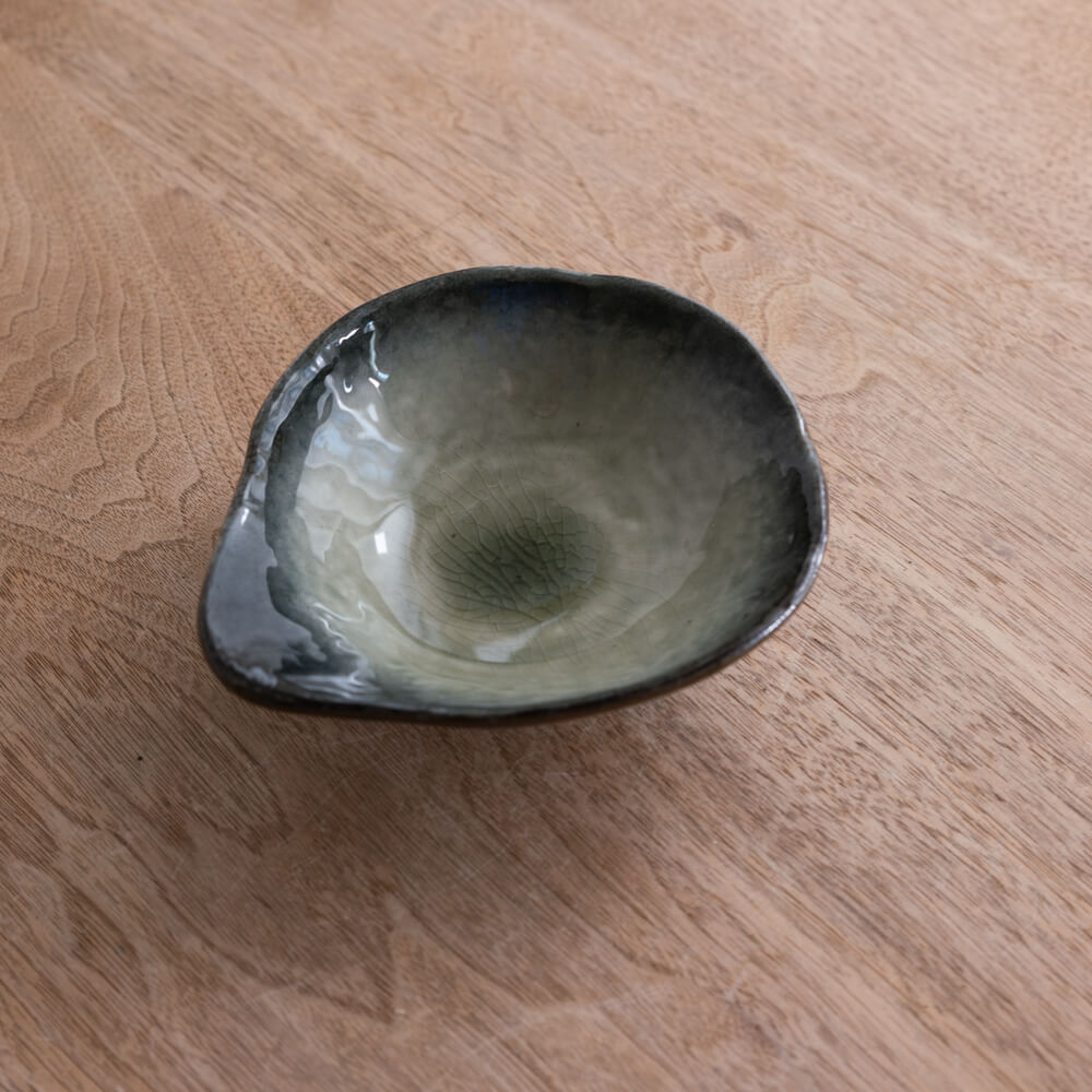 中心にじわりと広がる深いグリーン。外側へ向かうほど淡く変わる釉薬のゆらぎが、盛り付けに自然な陰影を生み出します。ひとつ置くだけで食卓に奥行きが生まれ、料理の見え方まで変えてくれる呑水です。