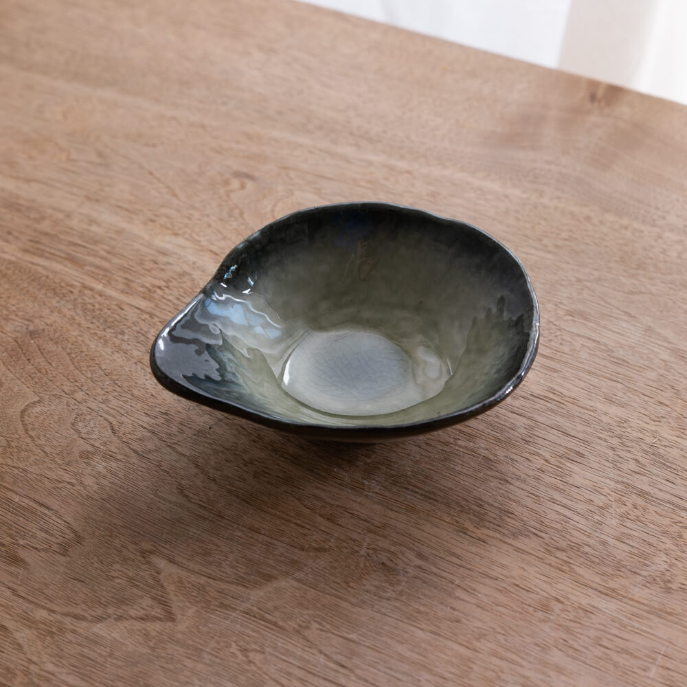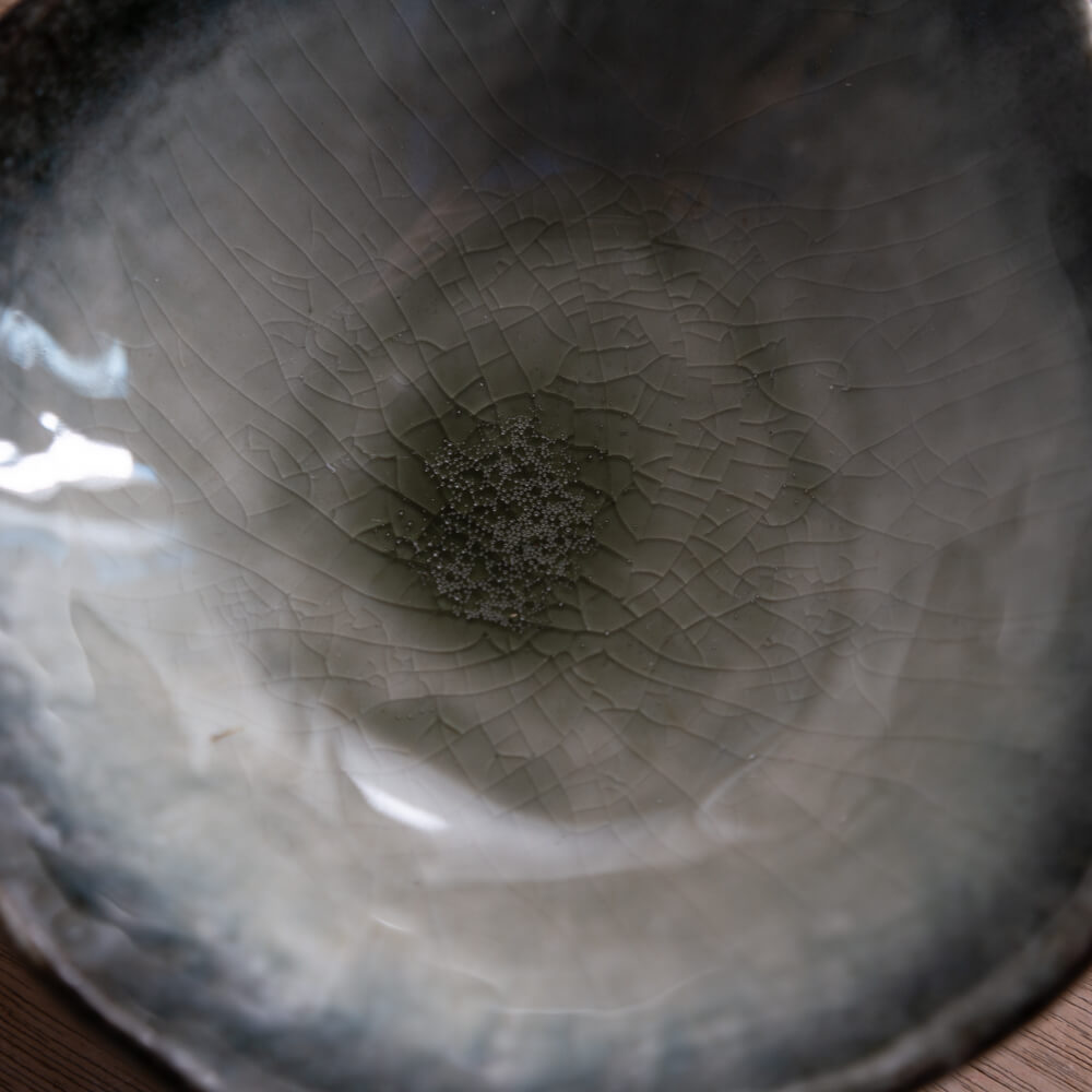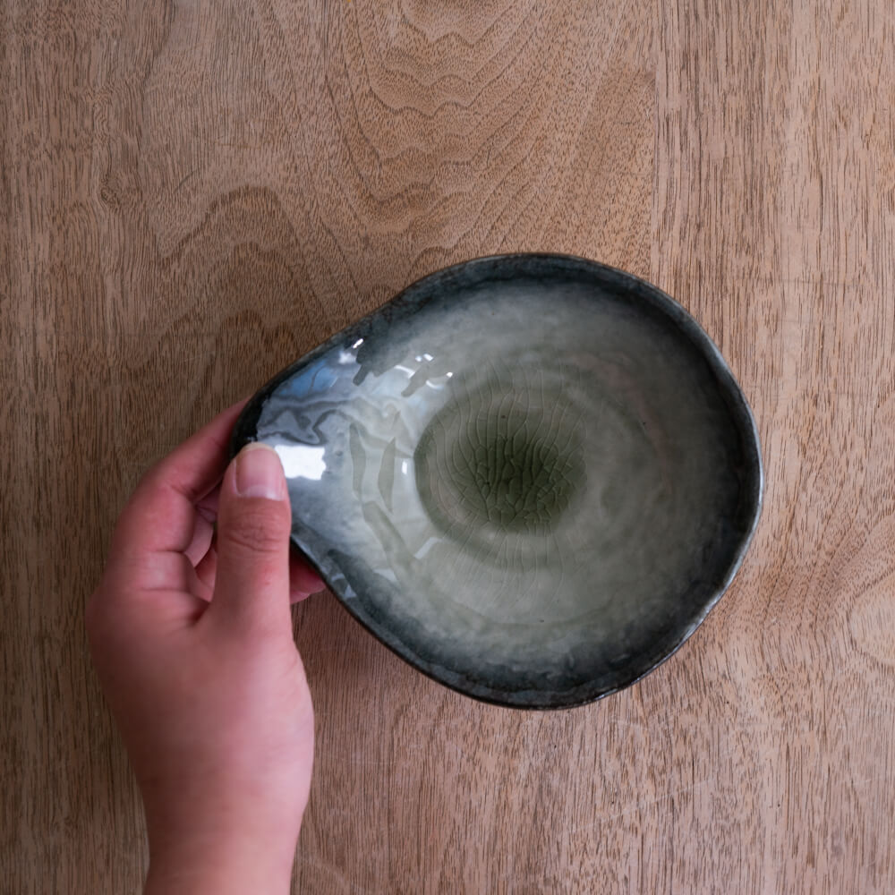 中心は深いグリーン、外側に向かって白みがかり、グレートーンへ。釉薬の濃淡が立体感をつくり、盛り付けた瞬間に料理の陰影がふわりと際立ちます。光を受けたときの微妙な色の変化も魅力で、時間帯で印象が変わる器です。