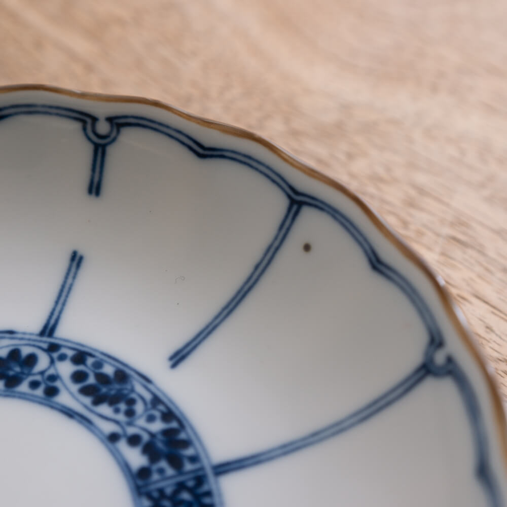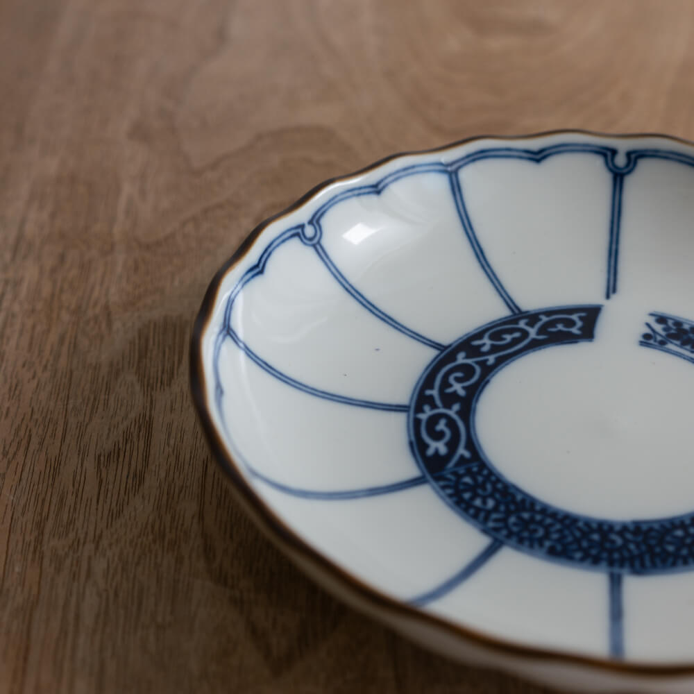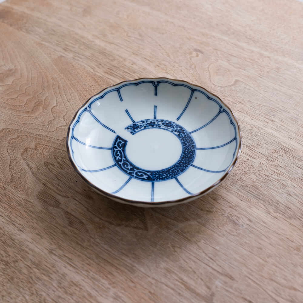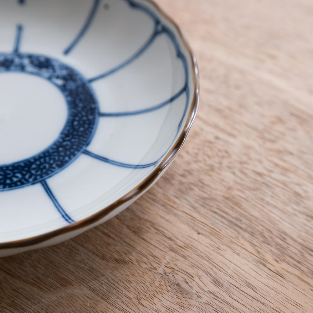 白磁のなめらかな素地に、染付の青がくっきりと映える5寸皿。輪つなぎ文様と菊割調の放射線が組み合わさったデザインは、日々の料理を自然と引き立て、すっと食卓を整えてくれます。副菜、取り皿、スイーツなど幅広く使いやすいサイズで、ひとつあるだけで日常が少し上質に感じられる一枚です。