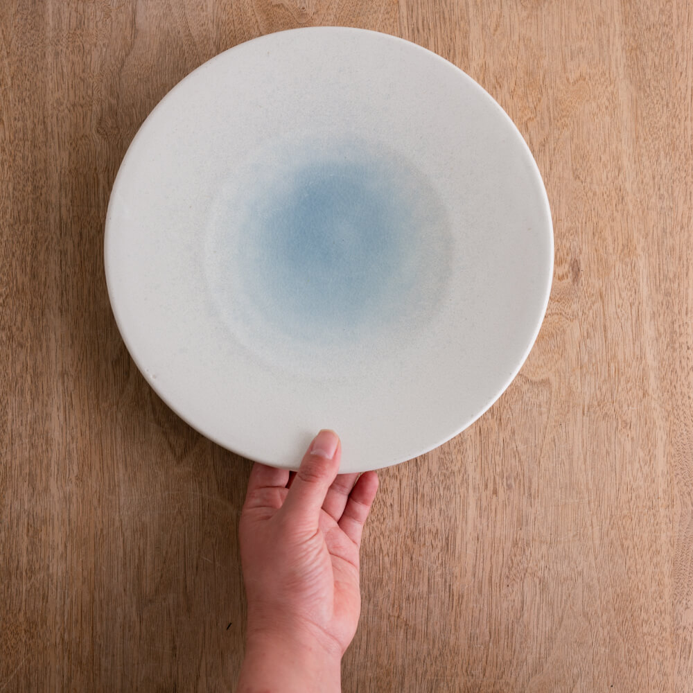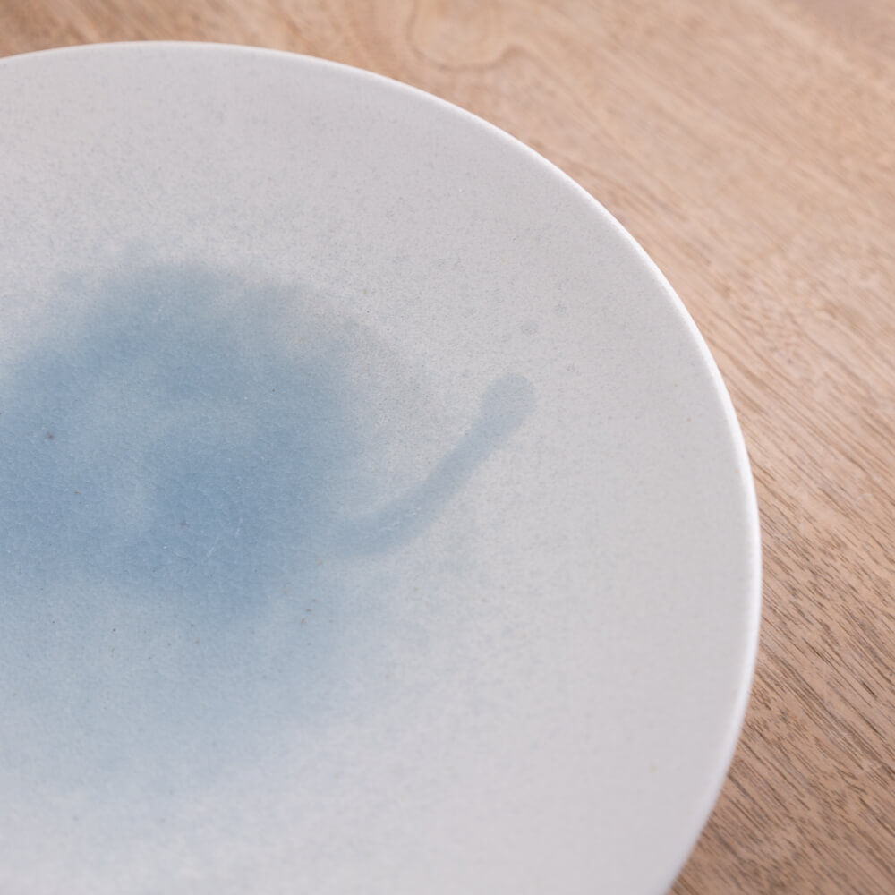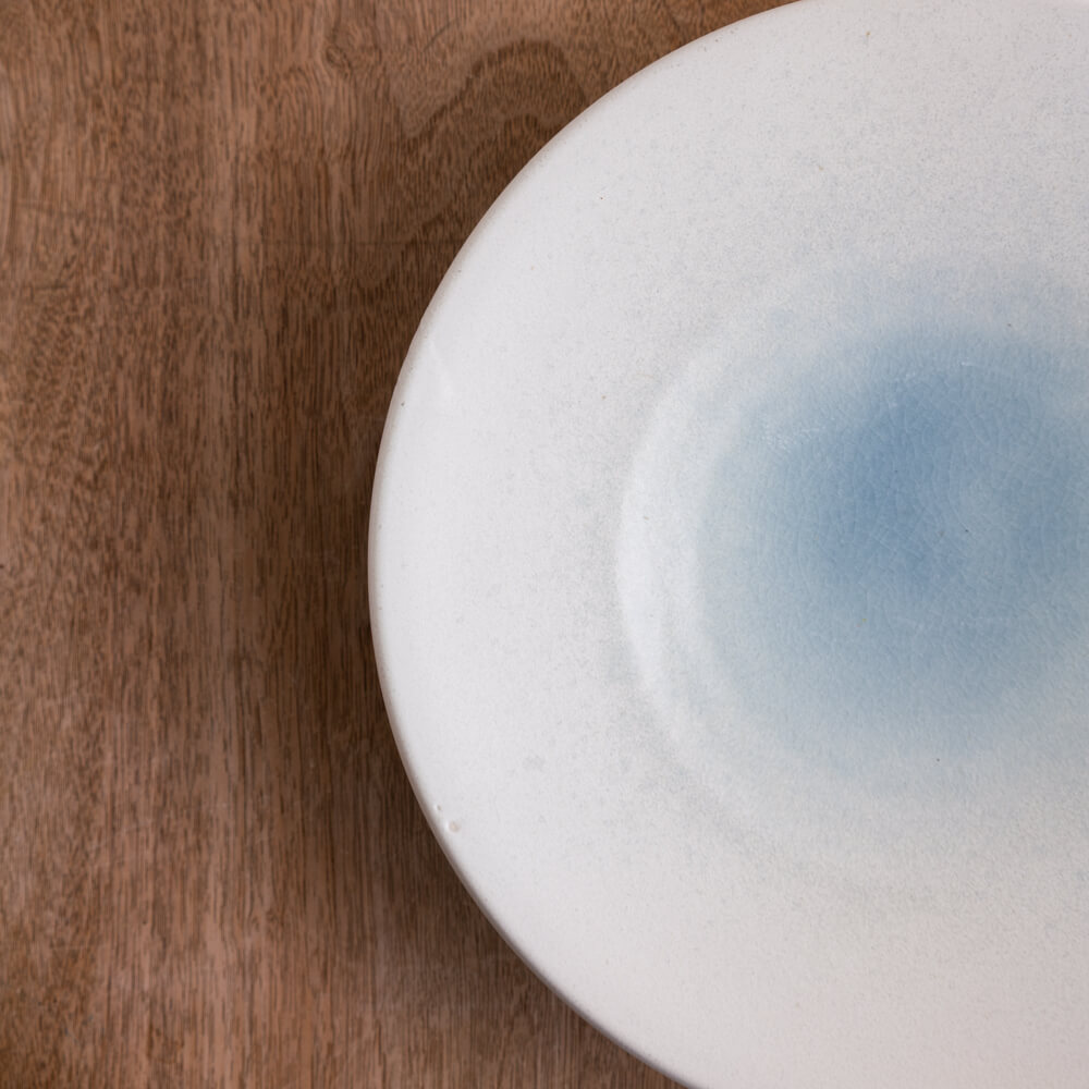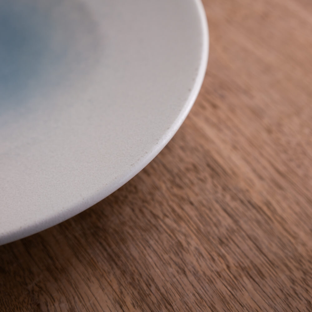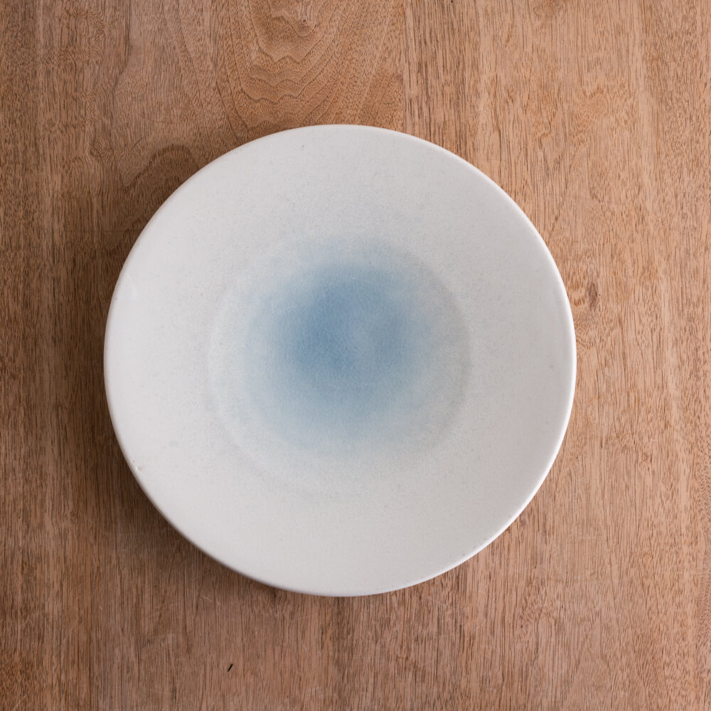 中心だけに色をとどめ、外側に向かって白へ溶け込むような表情。光の角度によって青の濃淡が変化し、シンプルでありながら印象に残る存在感があります。料理をのせたとき、皿の“余白”が景色の一部になるデザインです。