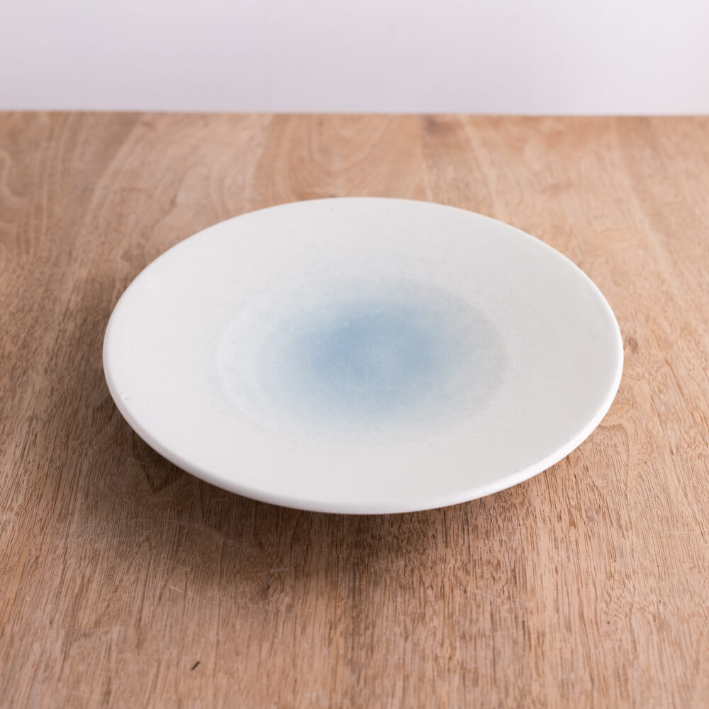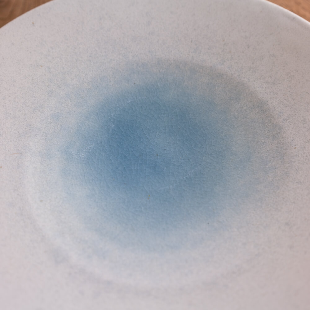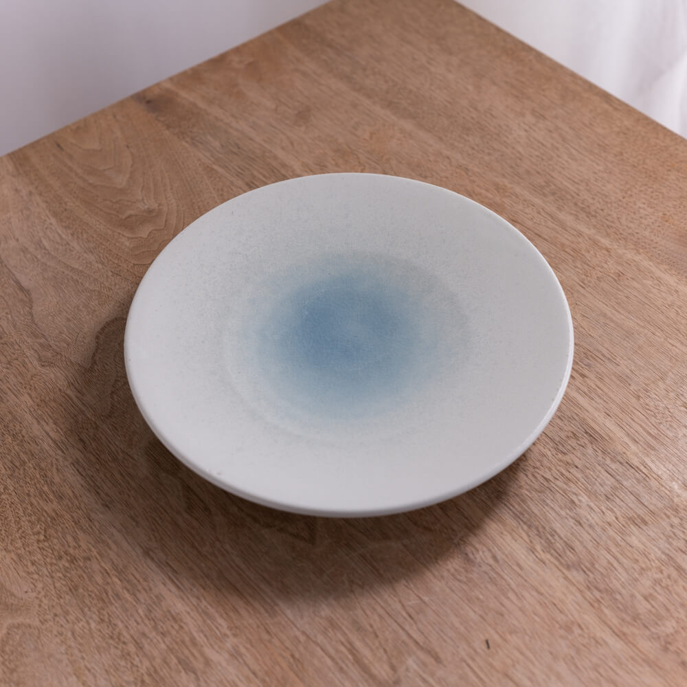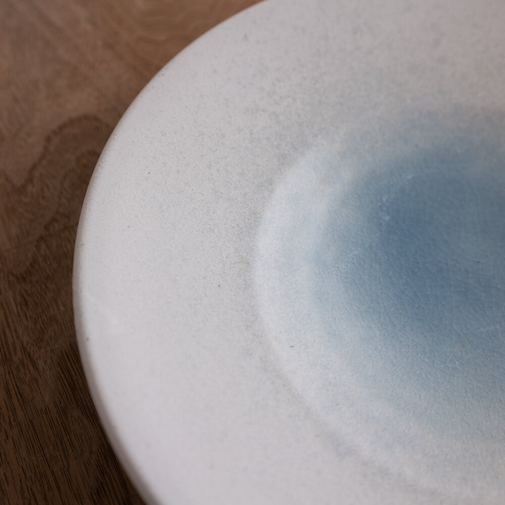中心だけに色をとどめ、外側に向かって白へ溶け込むような表情。光の角度によって青の濃淡が変化し、シンプルでありながら印象に残る存在感があります。料理をのせたとき、皿の“余白”が景色の一部になるデザインです。