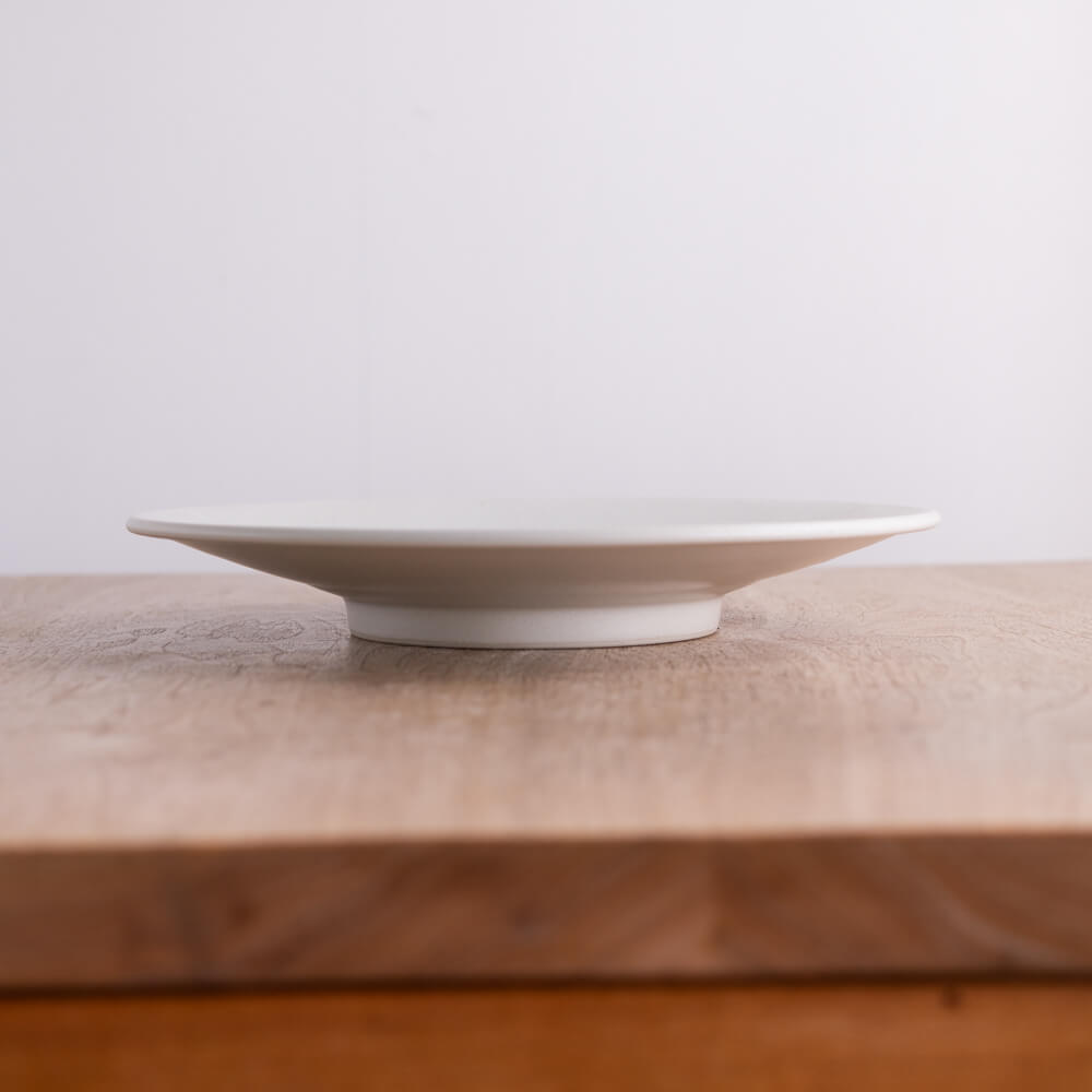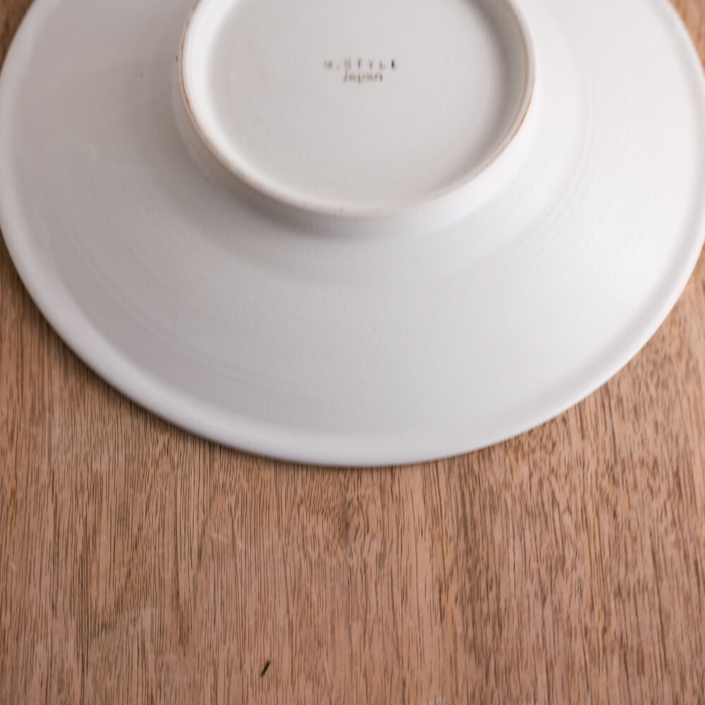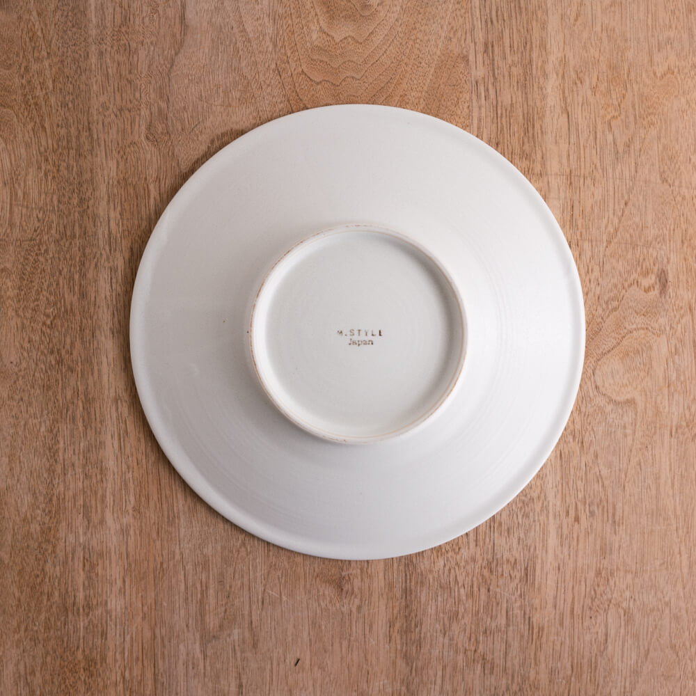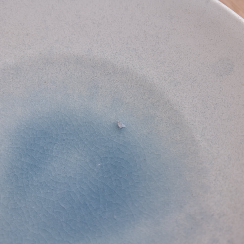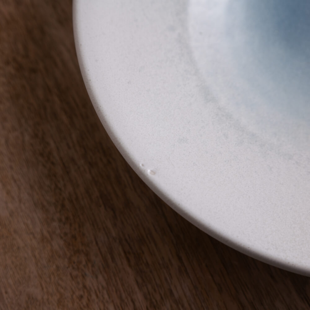 中心だけに色をとどめ、外側に向かって白へ溶け込むような表情。光の角度によって青の濃淡が変化し、シンプルでありながら印象に残る存在感があります。料理をのせたとき、皿の“余白”が景色の一部になるデザインです。