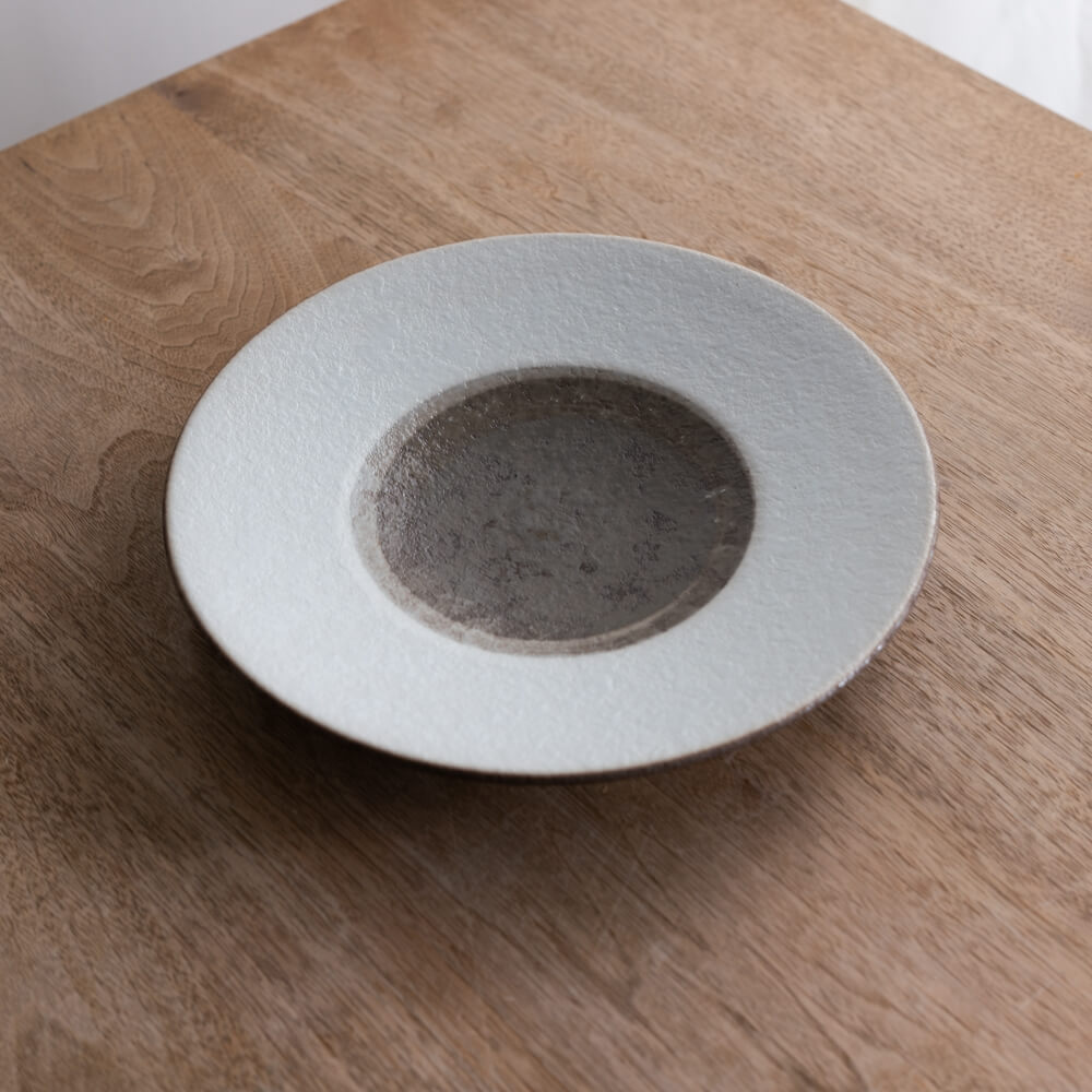 和陶器らしい、やさしい広がりをもつ一枚です。白化粧のマットな質感と、中央に落ち着く灰釉が、料理をふわりと受け止めます。段差の強い洋リムとは異なり、「面」で余白をつくるデザインのため、日常の献立もすっきりと美しく見せてくれます。