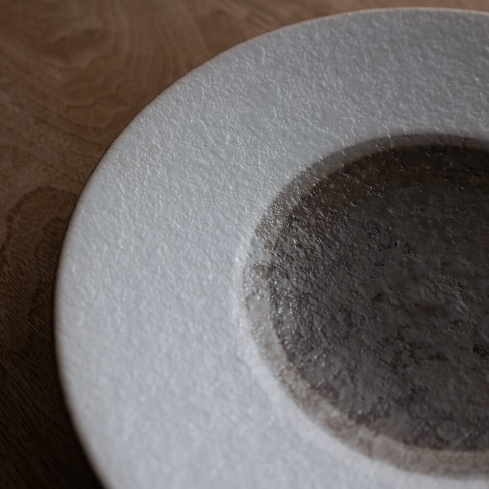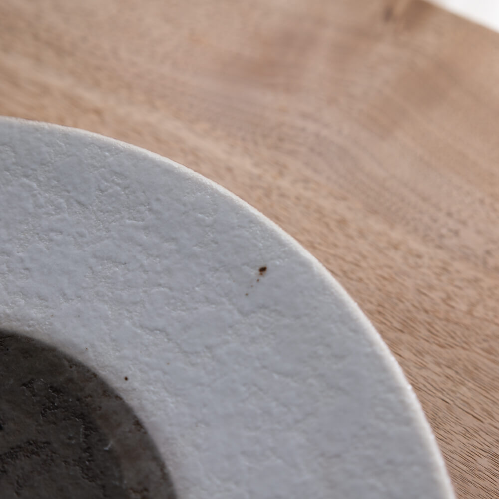 表面にはごく細かな凹凸があり、光を受けて静かにきらめきます。白化粧のマットな質感は、料理の色を濁さず、盛り付けた瞬間に“整った”印象を与えてくれます。