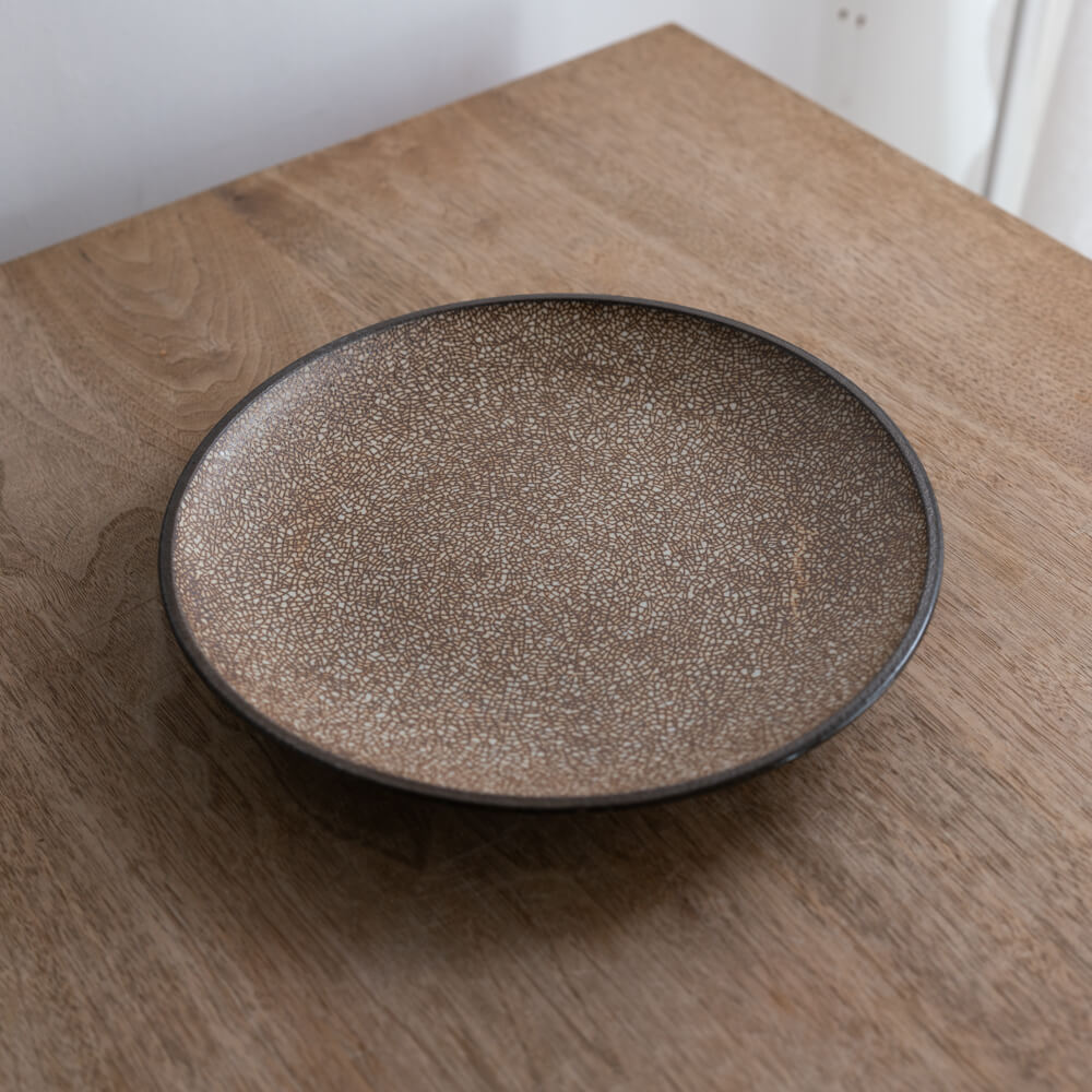 表面いっぱいに広がる細かなかいらぎ模様と、焦げたような落ち着いた縁色が印象的な和食器の大皿。φ26cmのゆったりサイズながら主張しすぎず、日々の料理を引き立てる存在感があります。前菜からメイン、盛り合わせまで幅広く活躍し、食卓に“静かな表情”を添えてくれます。